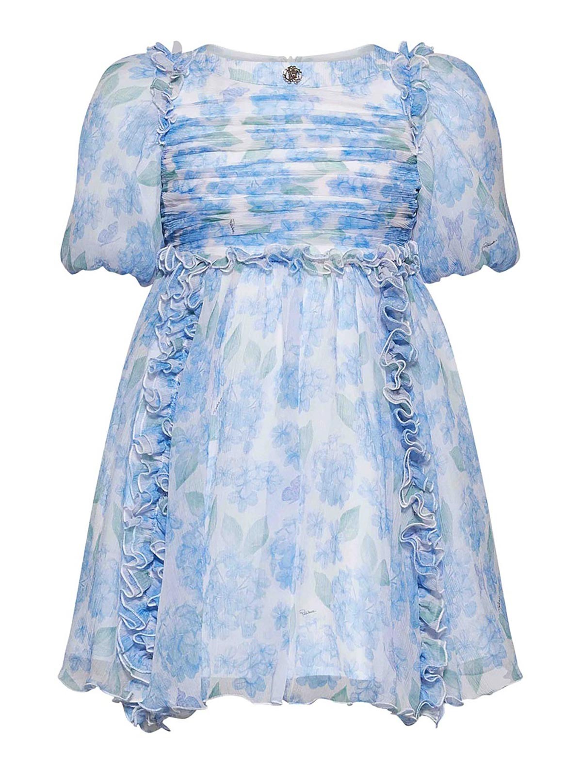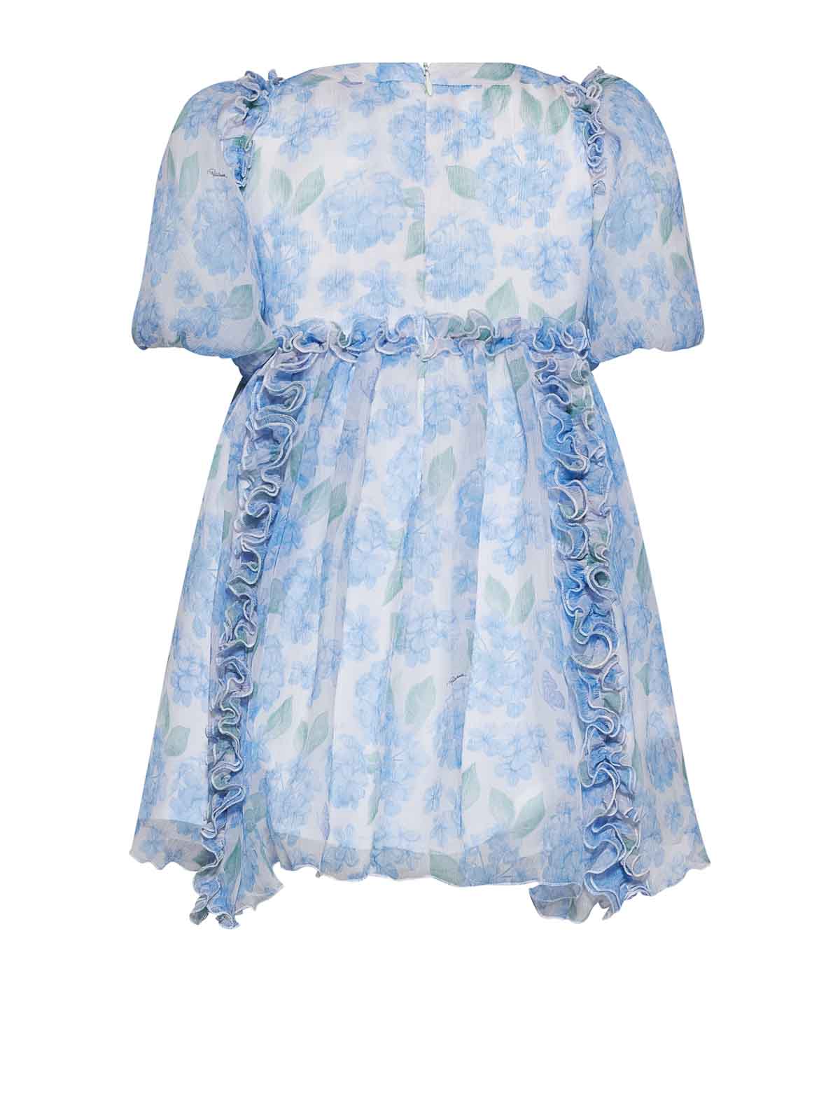 花柄プリントのハーフスリーブドレス。前面にギャザーのフリルが付いたフリル付きで、後ろにファスナーが付いています。