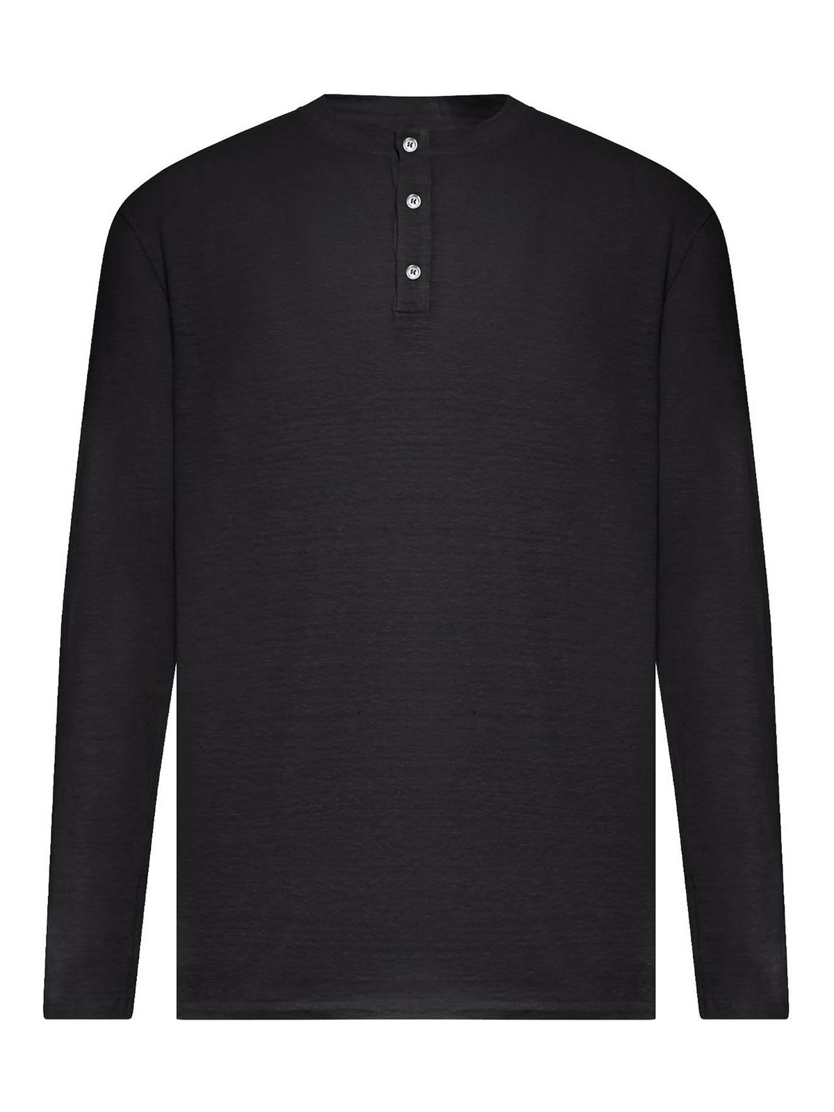 3つボタンのヘンリープラケット付きクルーネック、フロントボタン留め、レギュラーフィットのロングスリーブ、レギュラーフィット、ストレートヘム、リネンブレンド、色:黒