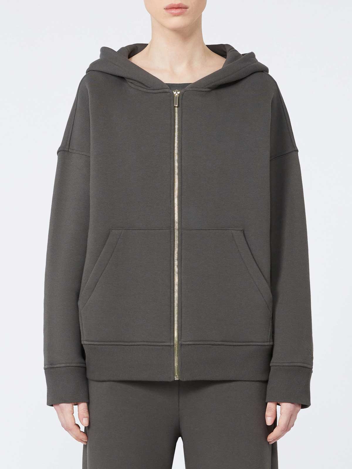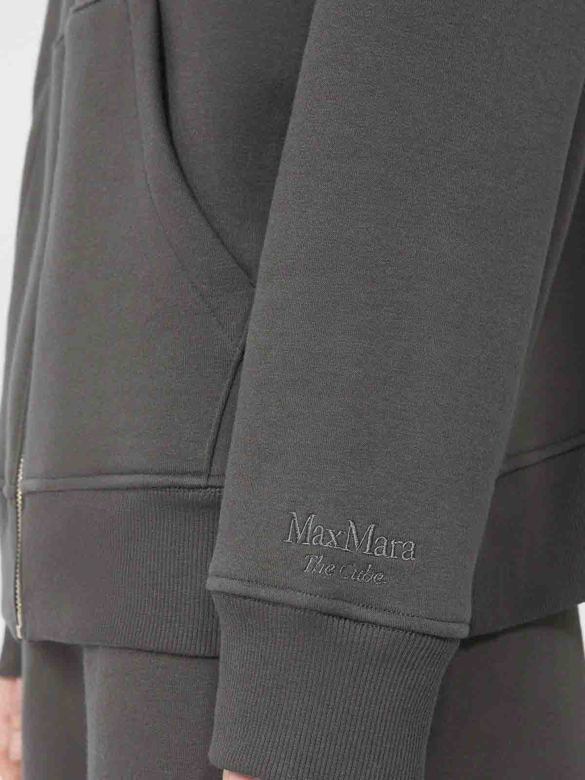 左手首に小さなロゴが刺繍されたフード付きスウェットシャツ。ダークグリーンの起毛スウェットシャツ。ロングローカットスリーブ、ファスナー付きポーチポケット、リブ編みの袖口、裾