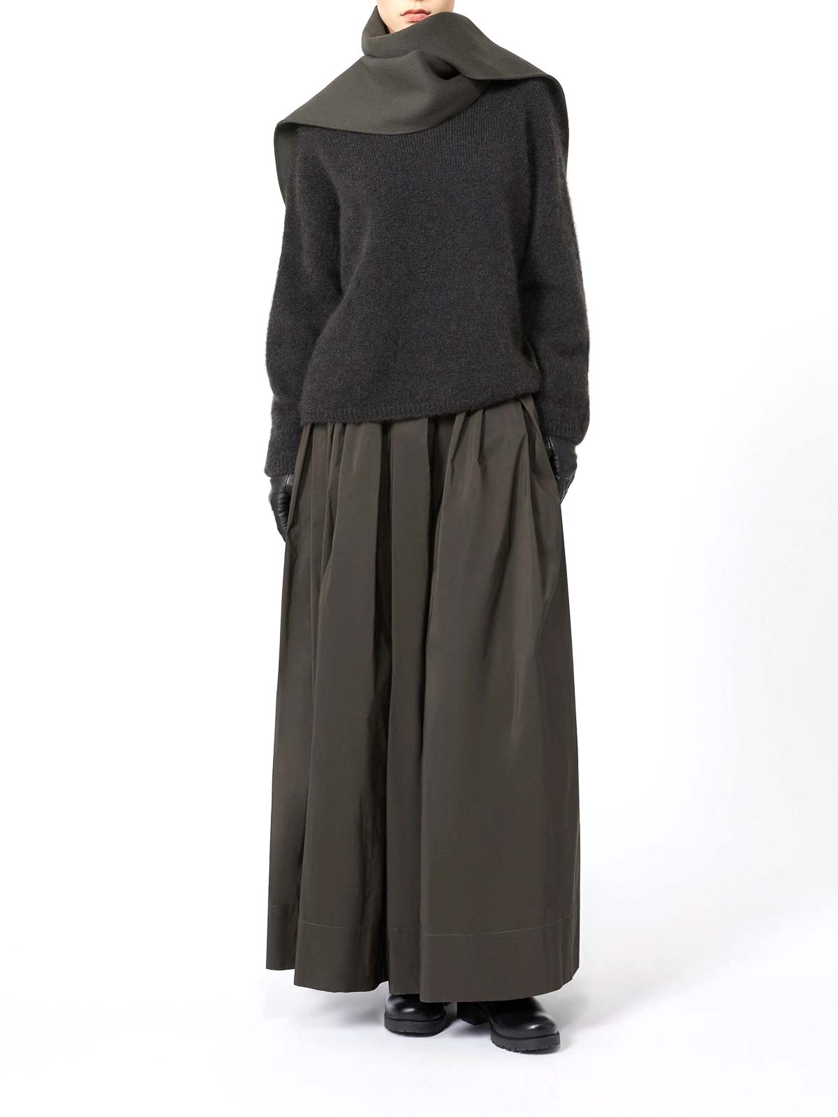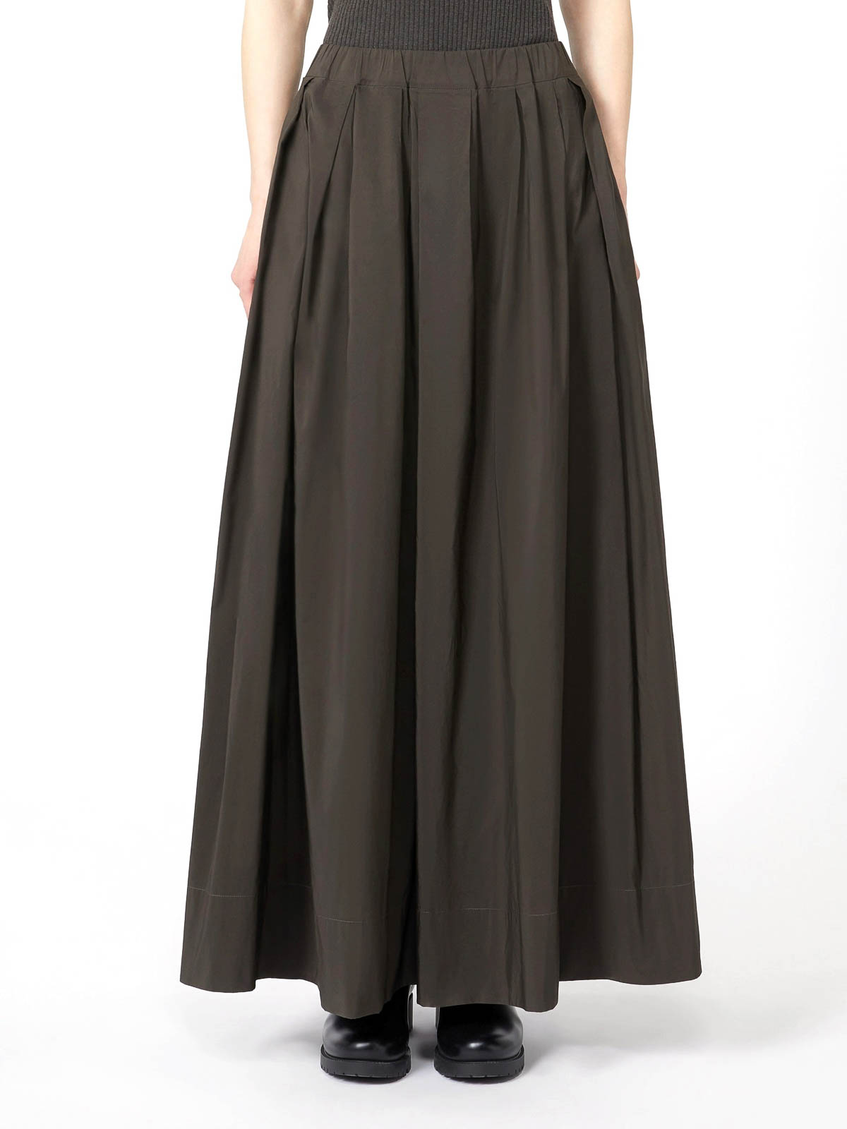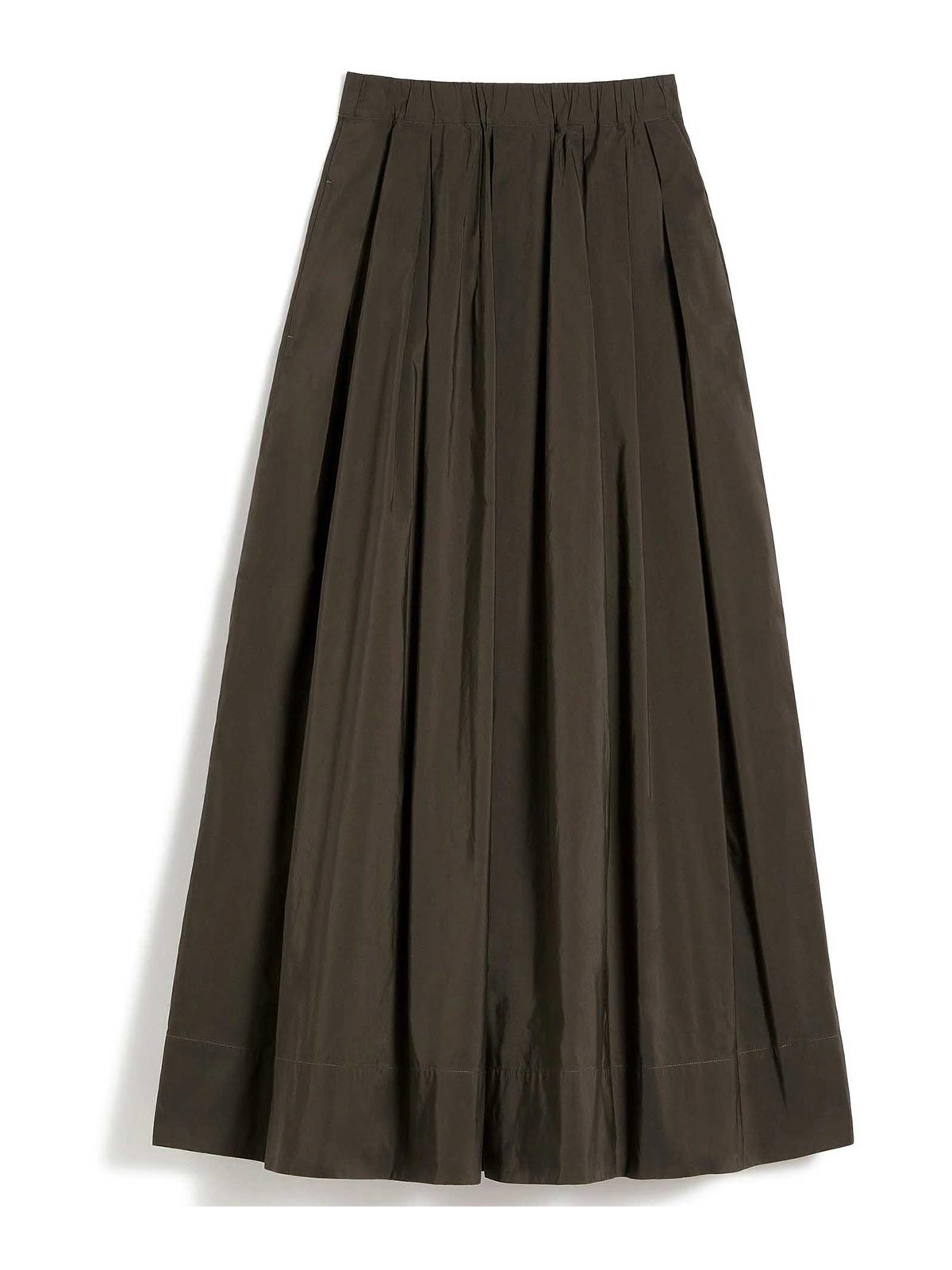 プリーツ柄のロングスカート、グリーンマイクロフェイルスカート、フレアフィット、ウエストゴム入り、サイドポケットは裏地なし