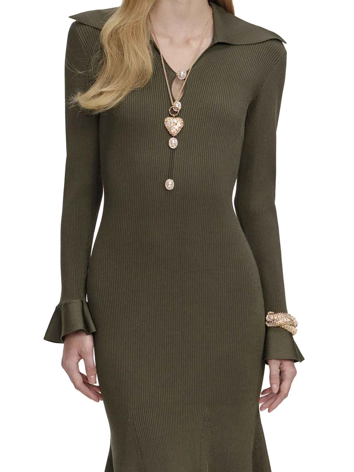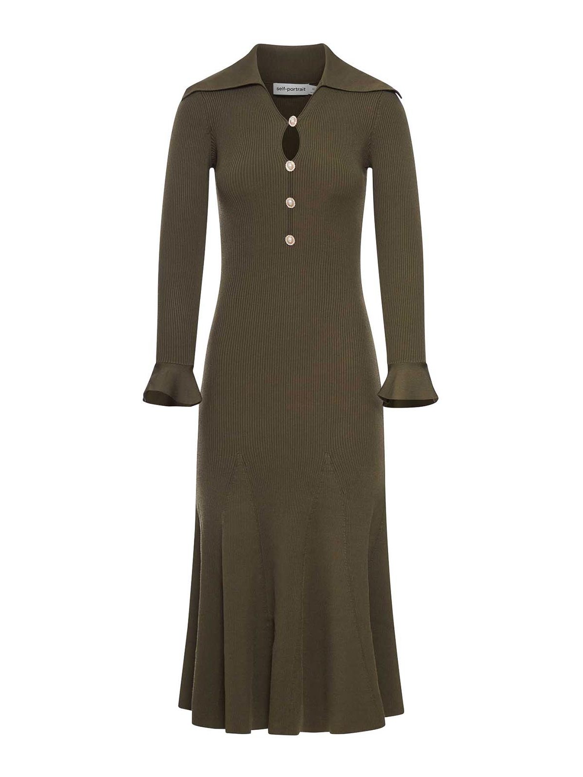 オーバーサイズの襟、透かし編みのミディドレス、キーホールフロント開口部、ストレッチ素材、フロントボタン留め、フレアヘム、ゴールドボタン、モデルの身長178cm、Sサイズ、色:カーキグリーン