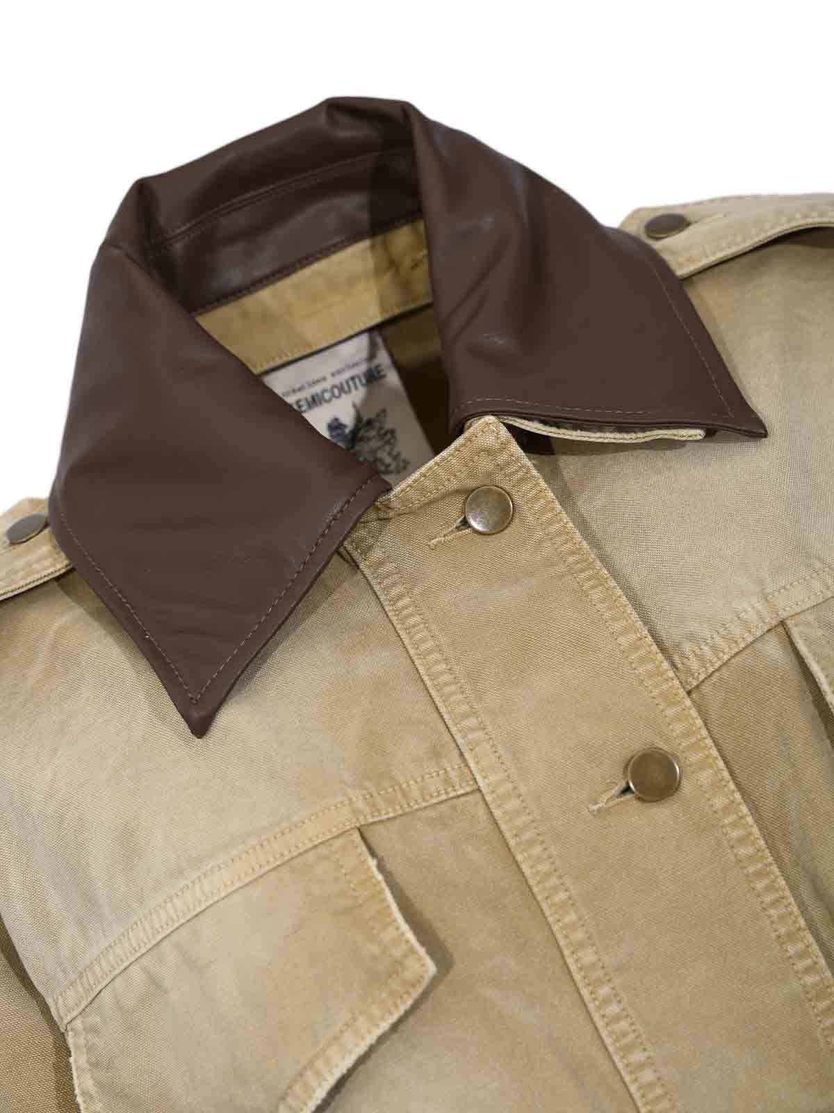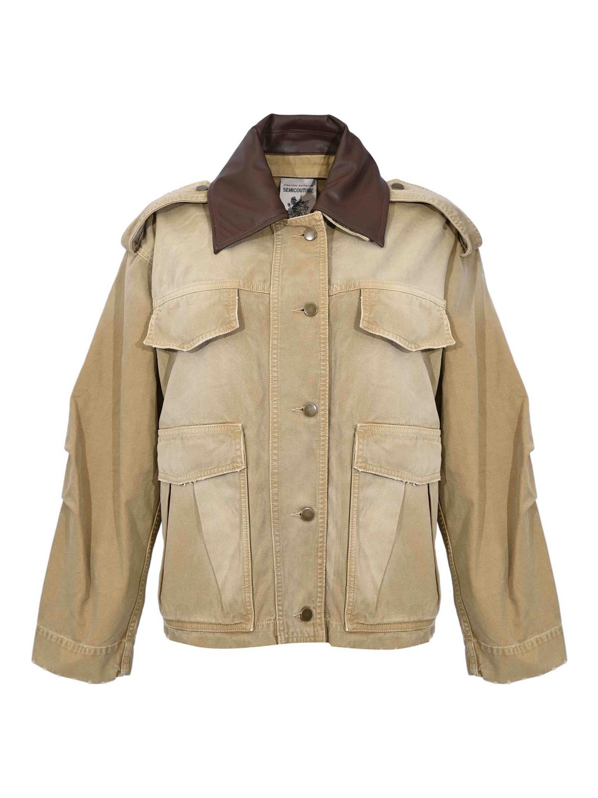 コットンキャンバスの女性用ジャケット、セミクチュール、グロリアモデル、生地:コットンキャンバス、生地:ソリッドカラー、袖:カフス付きロング、襟:コントラストの効いたエコレザーのインサート、クロージャー:フロントスナップボタン、ポケット:胸にフラップ、フロントにフラップ付きパッチ、詳細:ボタン付きショルダーストラップ、ビジブルステッチ、レザーエフェクトカラーインサート、ストレートボトム、裏地:いいえ、フィット:ソフト