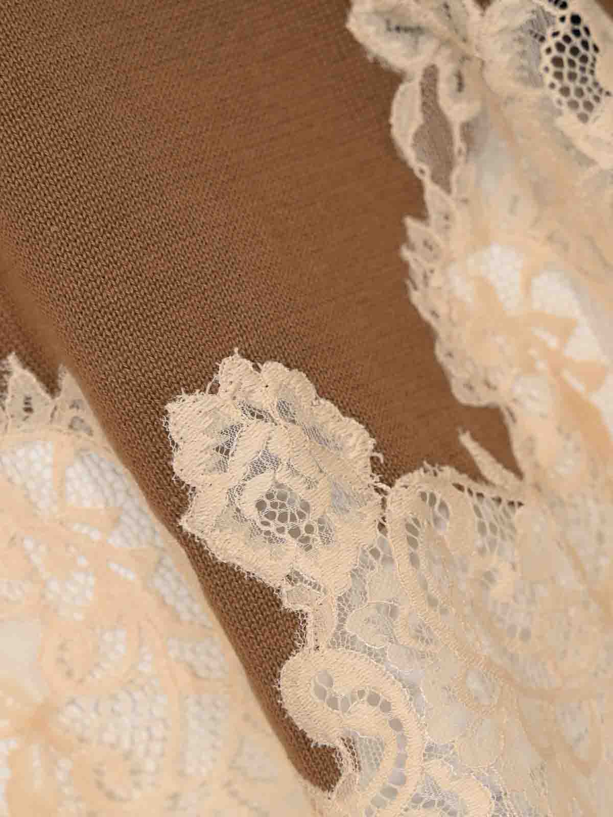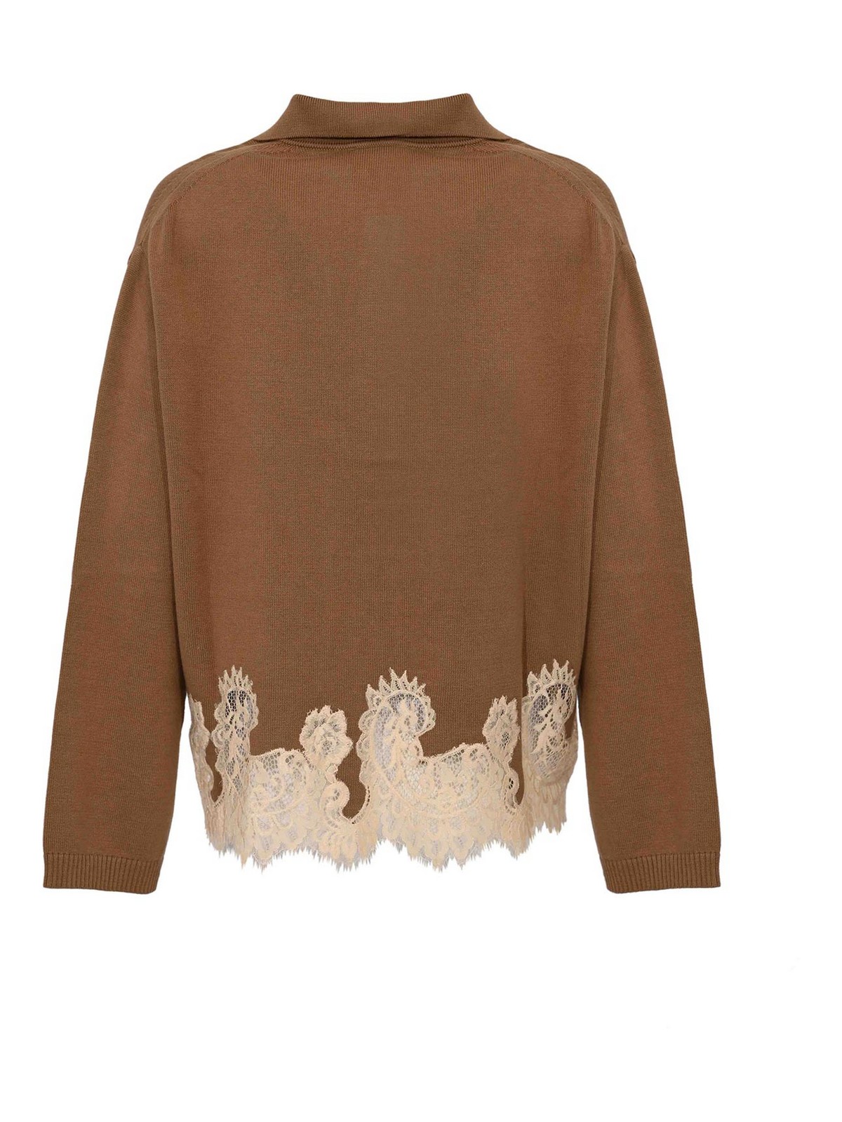 女性用コットンポロシャツ、セミクチュール、オーレリアナモデル、生地:コットンニット、パターン:コントラストの効いたレースインサート、袖:リブ編みの袖口が付いたロング、襟:V字型の開口部が付いたポロカラー、クロージャー:なし、ポケット:なし、ディテール:前後の裾に花柄レースインサート、わずかにスカラップレースエフェクトヘム、ストッキネットステッチ、裏地:いいえ、フィット:ソフト