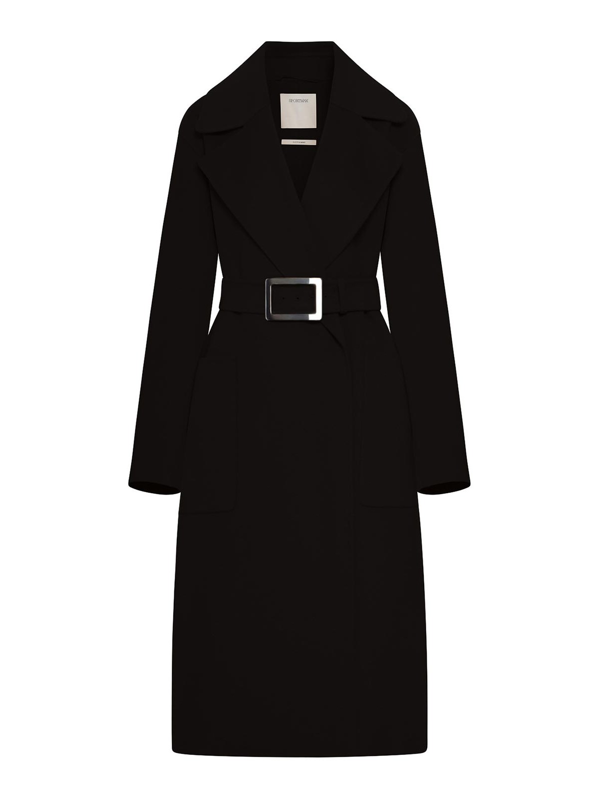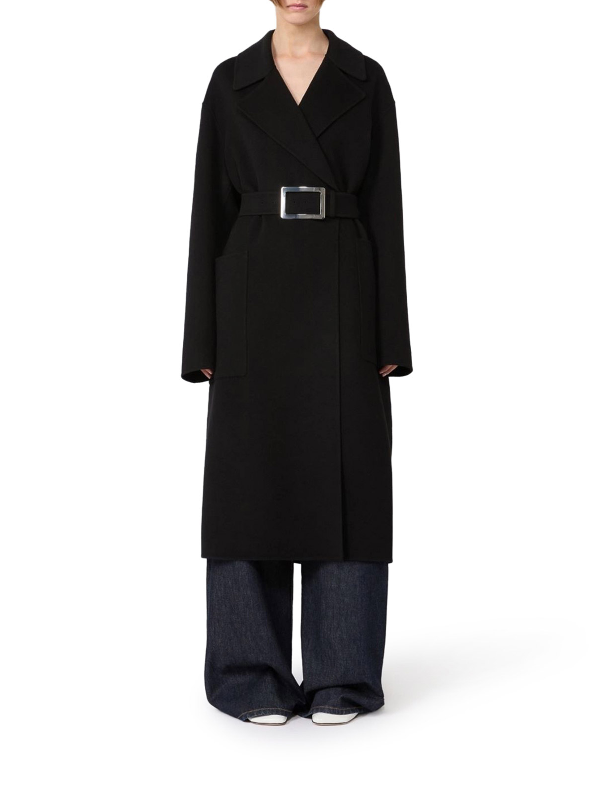 ロングコート、ラップスタイル構造、両面ピュアウール製、ワイドラペル、メタルバックルクロージャー付きファブリックベルト、サイドパッチポケット、ルーズフィット、カラー:ブラック