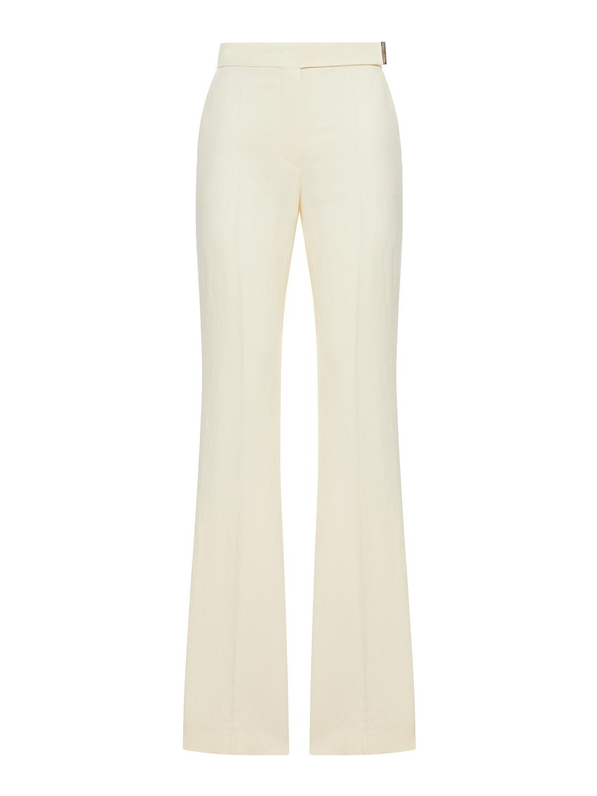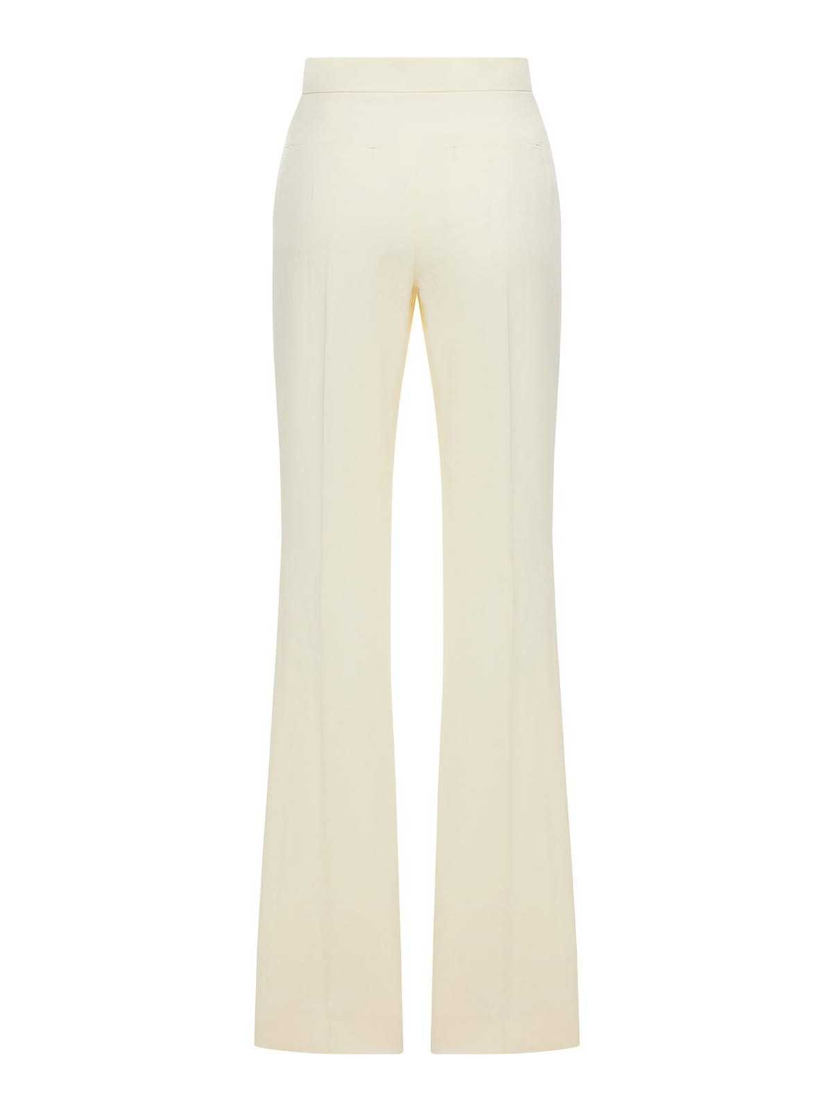 フレアパンツ、ローウエスト、ウエストバンドと小さなメタルバー、太ももにかけてフィットし、下部にフレア加工、下部にメタルディテール、サイドスラントポケットとリアウェルトポケット、前後にアイロンをかけた折り目、レギュラーフィット、色:ライトイエロー