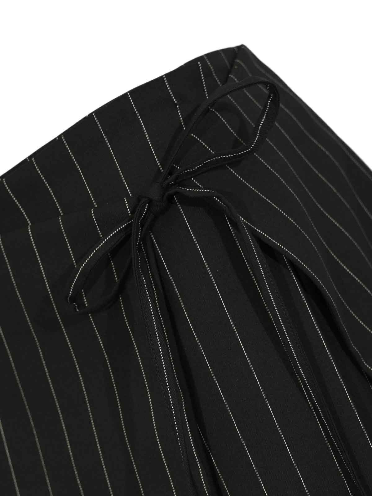 女性用ピンストライプギャバジンミニスカート、スポーツマックス、spxfatti モデル、生地:ストレッチウール混紡ギャバジン、パターン:ピンストライプ、ウエスト:ロー、クロージャー:内部スナップボタンとサイドで結ぶレース、ポケット:なし、長さ:ショート、ディテール:パネルとサイドレースを重ねたラップ構造、裏地:S、フィット:レギュラー