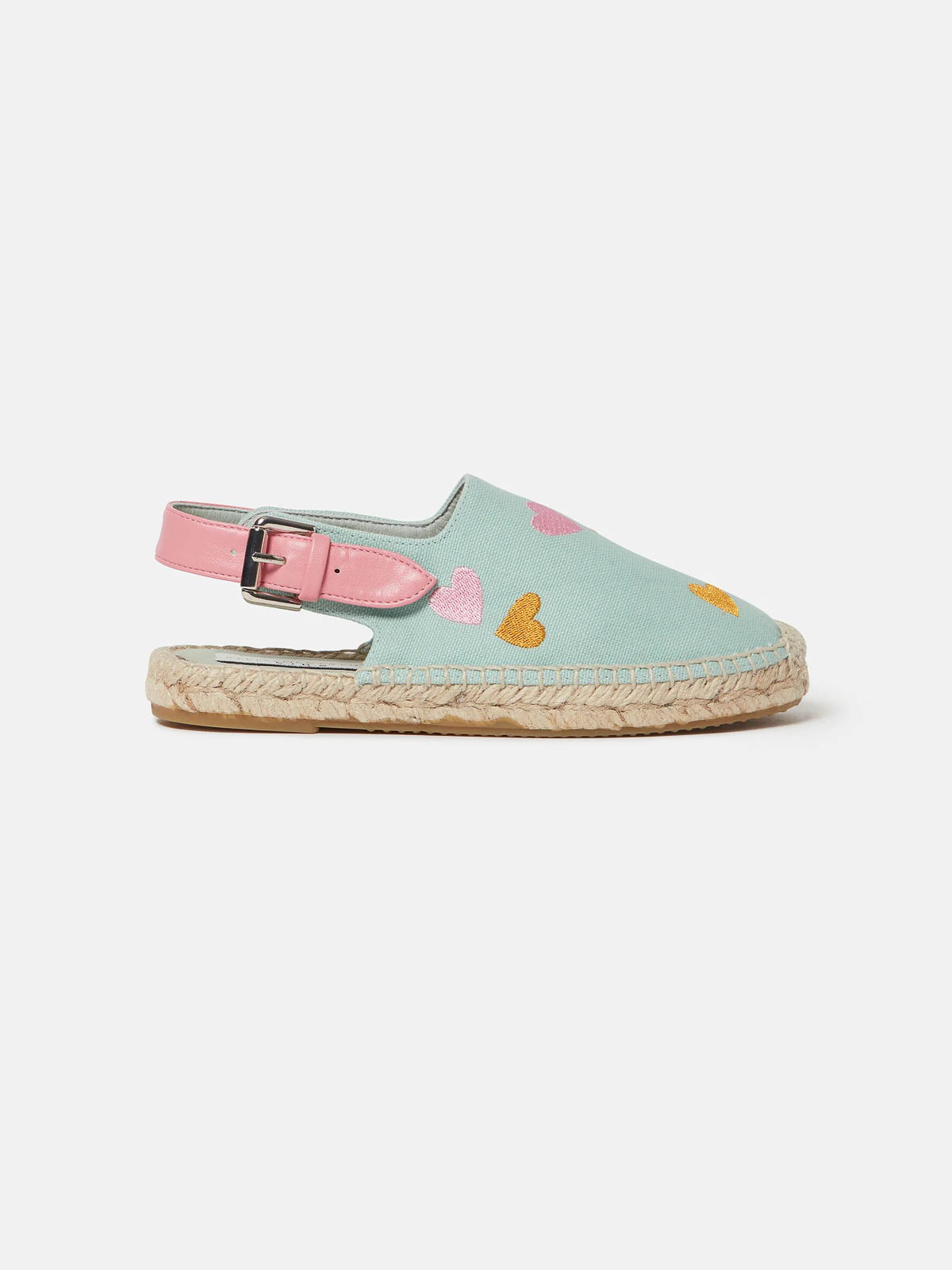 ジュート織り、つま先はクローズドで、ハート型のアンクルバックルが付いています