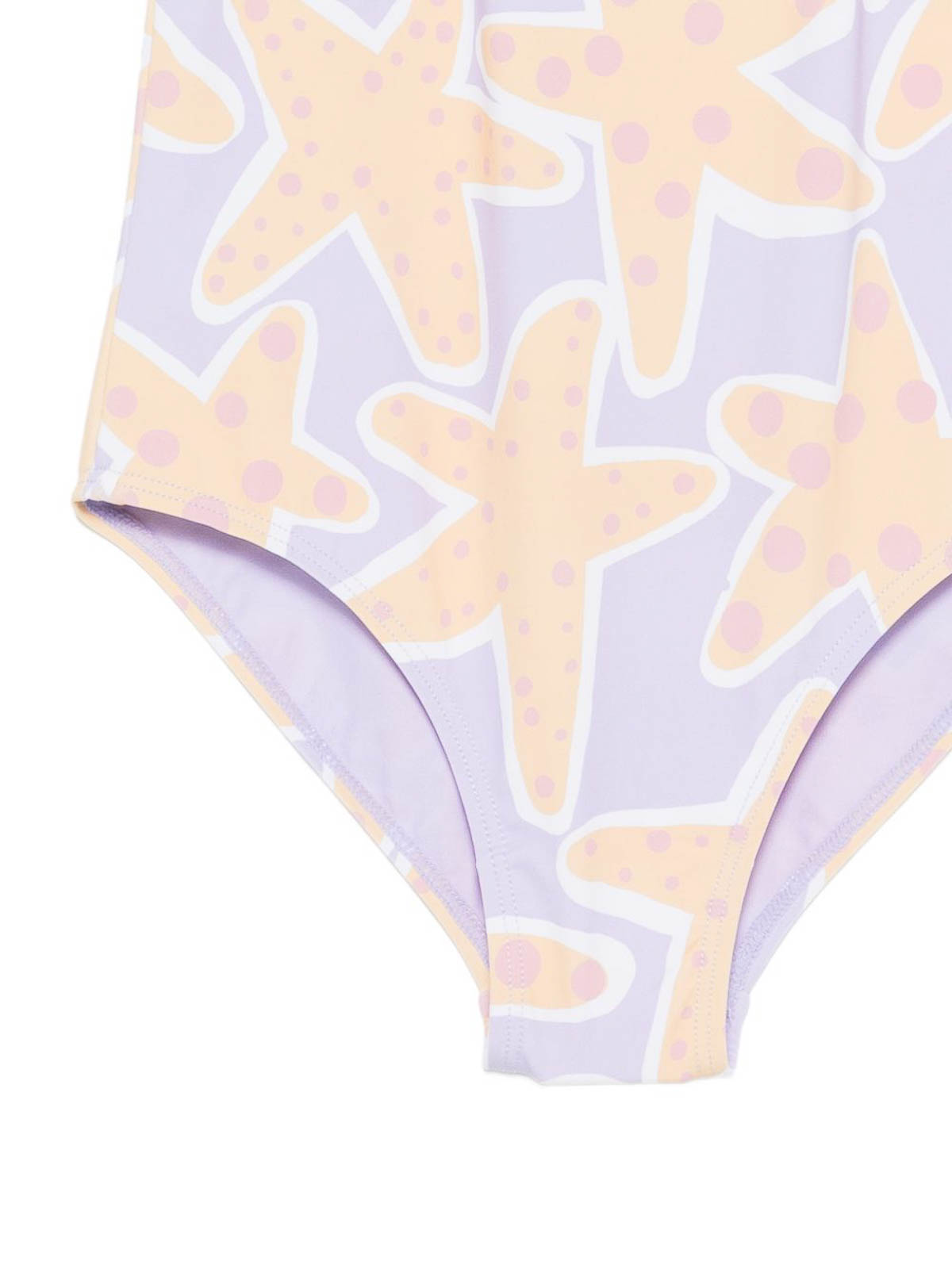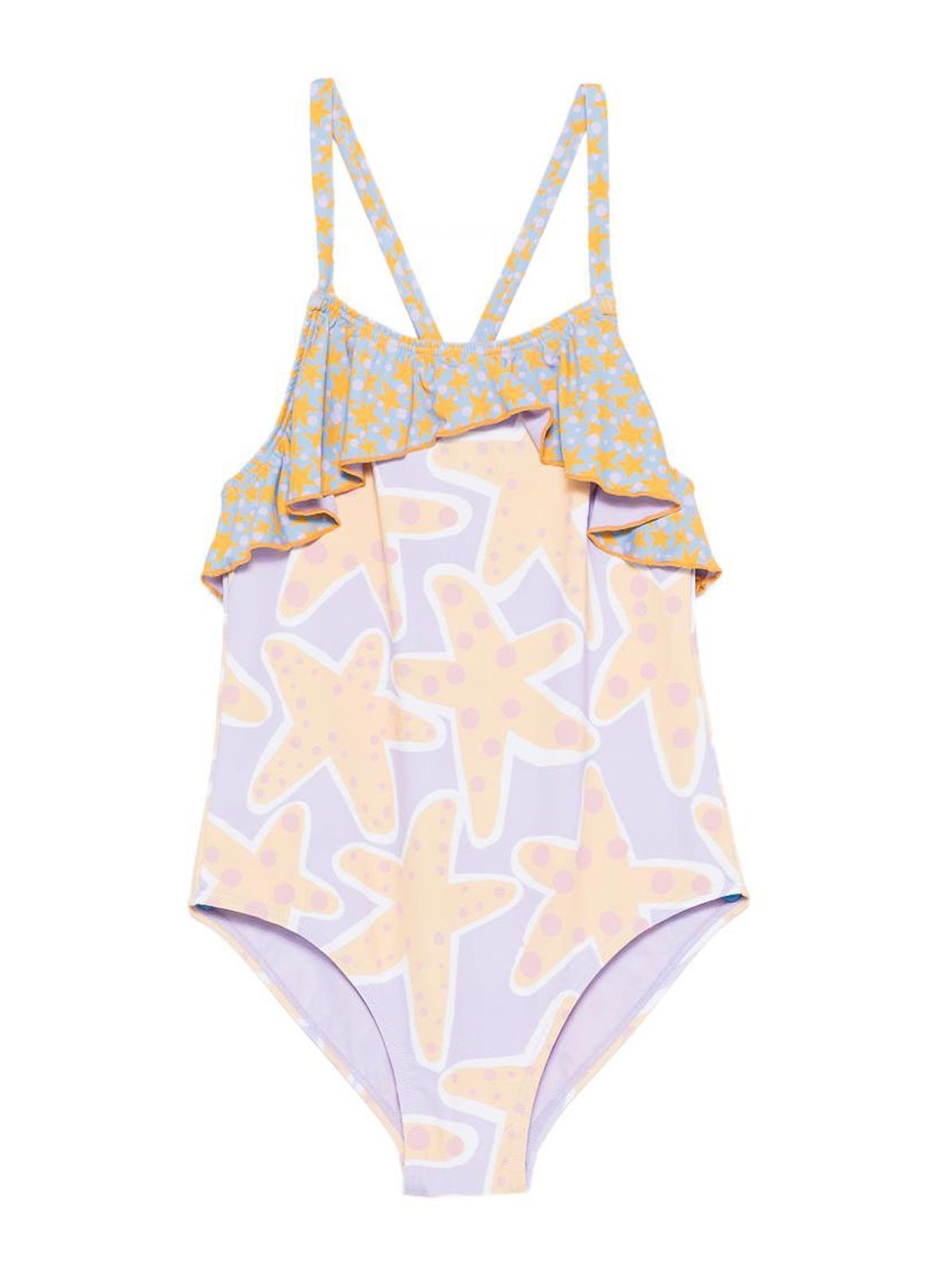 ライラックプリントの水着は、フリルとクロスバンドが付いたスターフィッシュプリントが特徴です