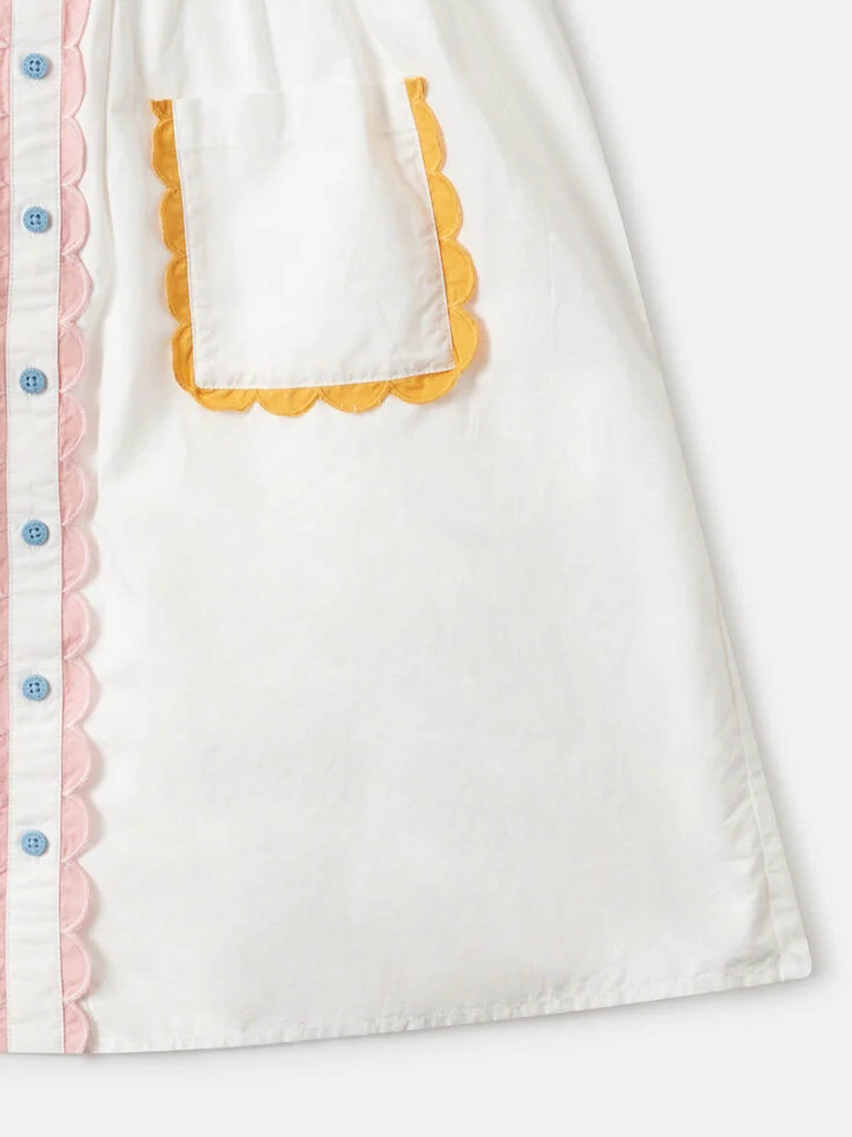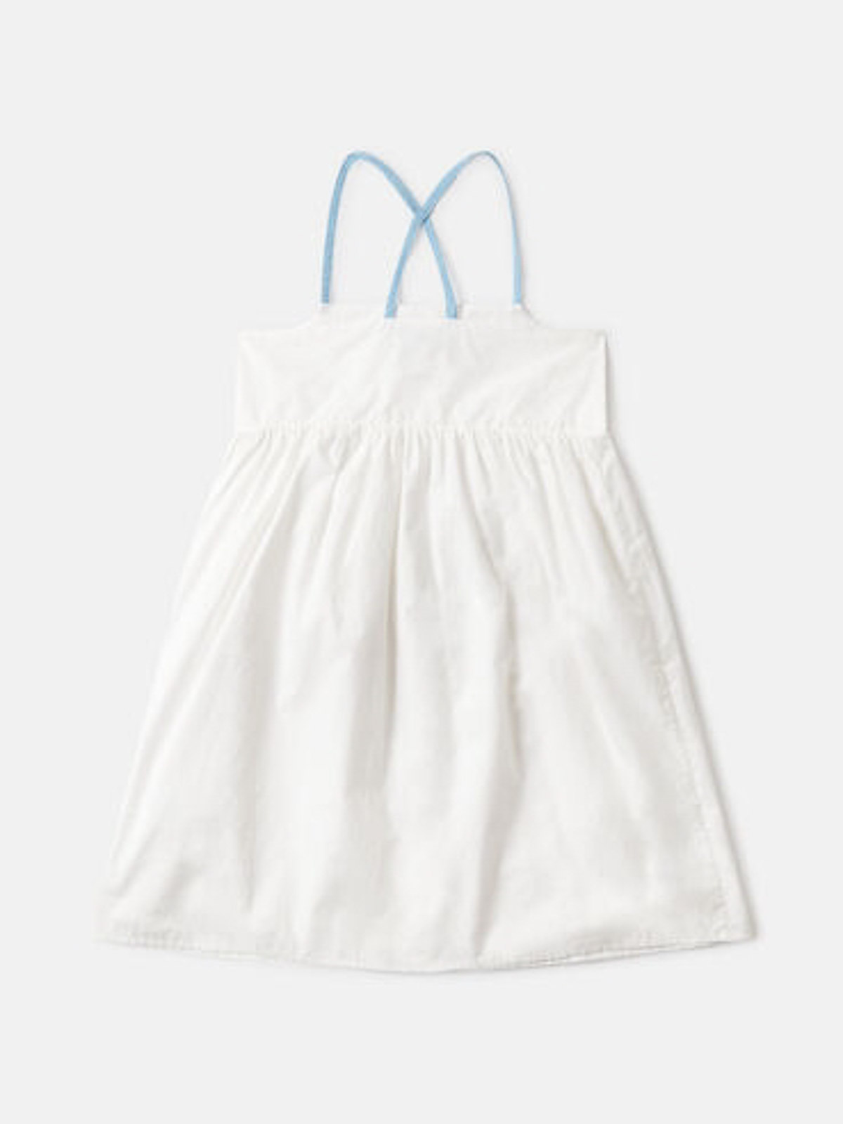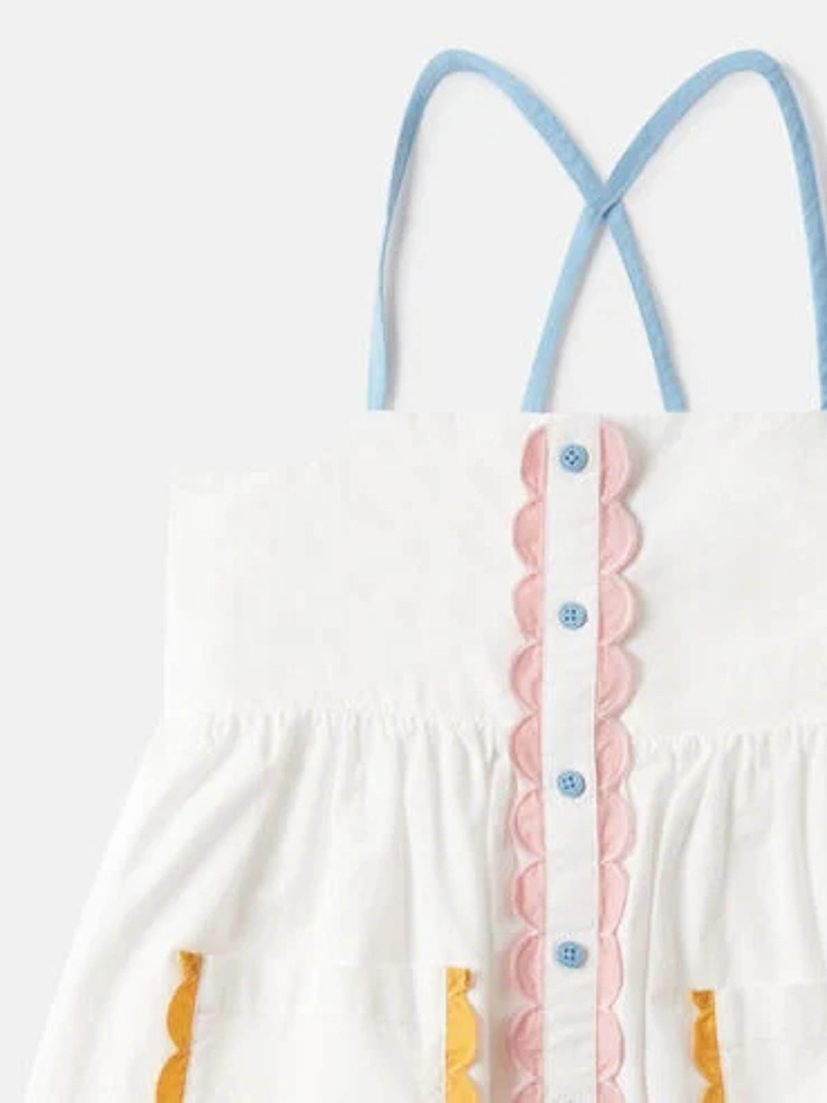 白いピナフォアドレス、コントラストカラーのパッチポケット、調節可能なショルダーストラップ、フロントボタン、Aラインシルエットプルアップ、環境にやさしい素材で作られています