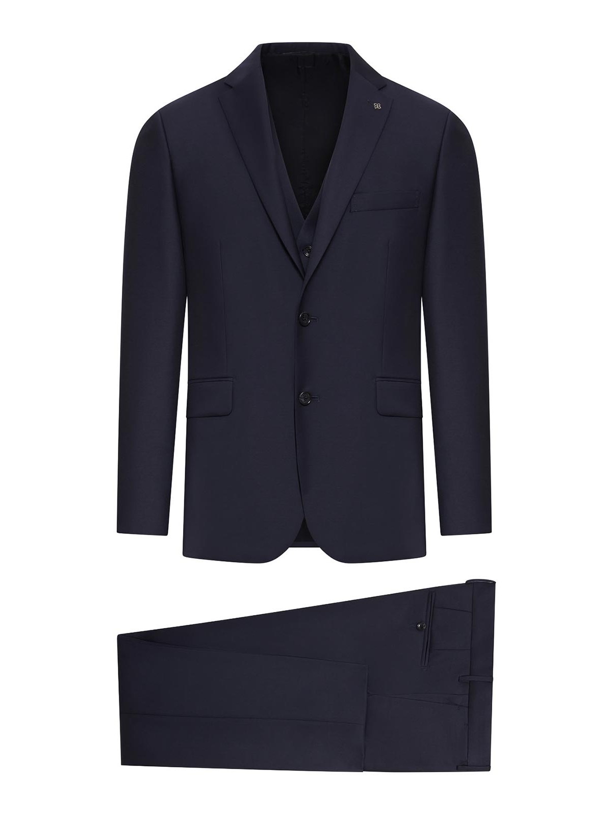 ジャケット、フロントクロージャーが2つ付いたシングルブレストデザイン、すっきりとしたステッチのノッチラペル、ストラクチャードショルダー、ウェルトチェストポケット、フロントフラップポケット、4ボタンカフス付きロングスリーブ、裏地付きズボン、フロントボタンとカバー付きジッパー、ベルトループ付きレギュラーウエスト、斜めサイドポケット、バックウェルトポケット、すっきりフィットベストのストレートレッグ、4ボタンフロントクロージャー付きシングルブレストデザイン、ディープV ネック、フロントウェルトポケット、調節可能なストラップ付きの滑らかなバック、100% ウール、色:ブルー