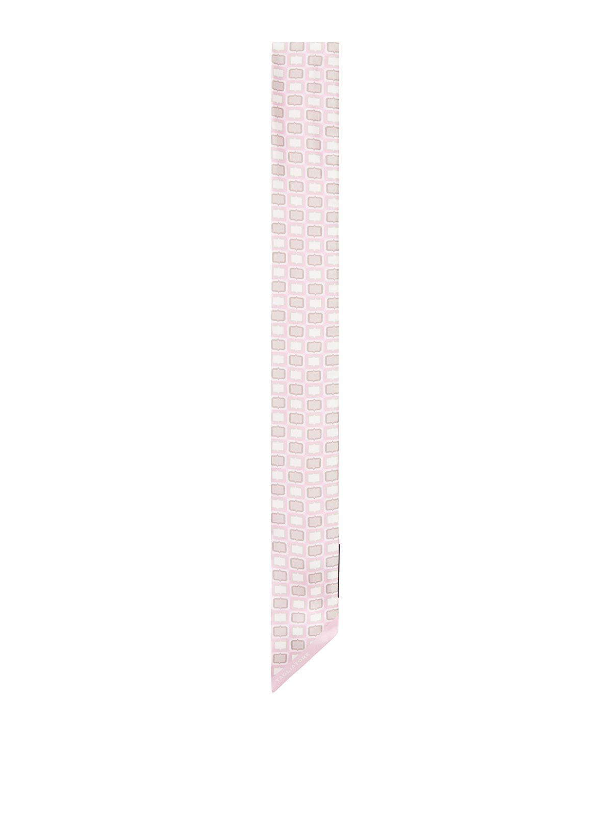 流れるような明るい質感のコットンスカーフ、全体に幾何学模様、繰り返しのグラフィックデザイン、先のとがった先端、角にコントラストの効いたロゴ、色:ピンク