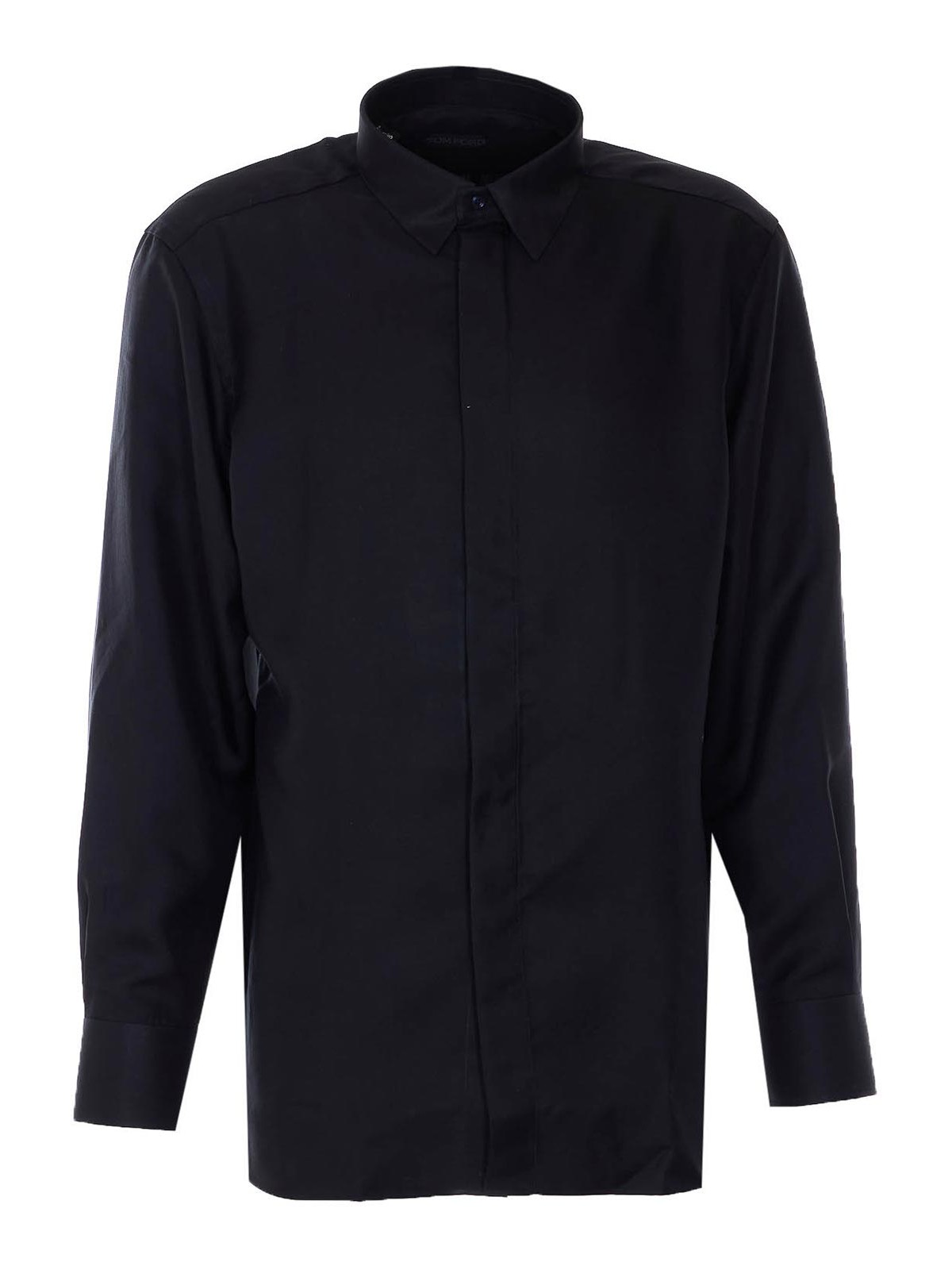 トムフォードブラックウォッシュドレープシャツ、フロントボタン留め、長袖、レギュラーカラー、袖口にボタン付き