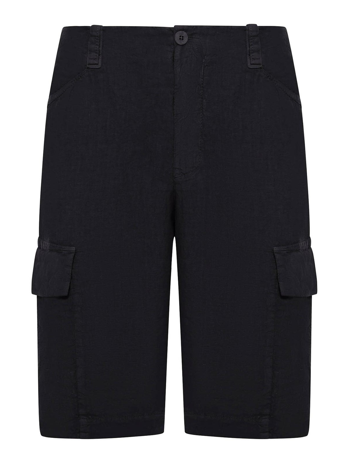 カバーフライ付きフロントボタンクロージャー、ウエストにベルトループ、脚にフラップ付きサイドパッチポケット、バックウェルトポケット、膝丈、ストレートフィット、レギュラーフィット、仕上げ済みストレートヘム、100% リネン、カラー:ブラック