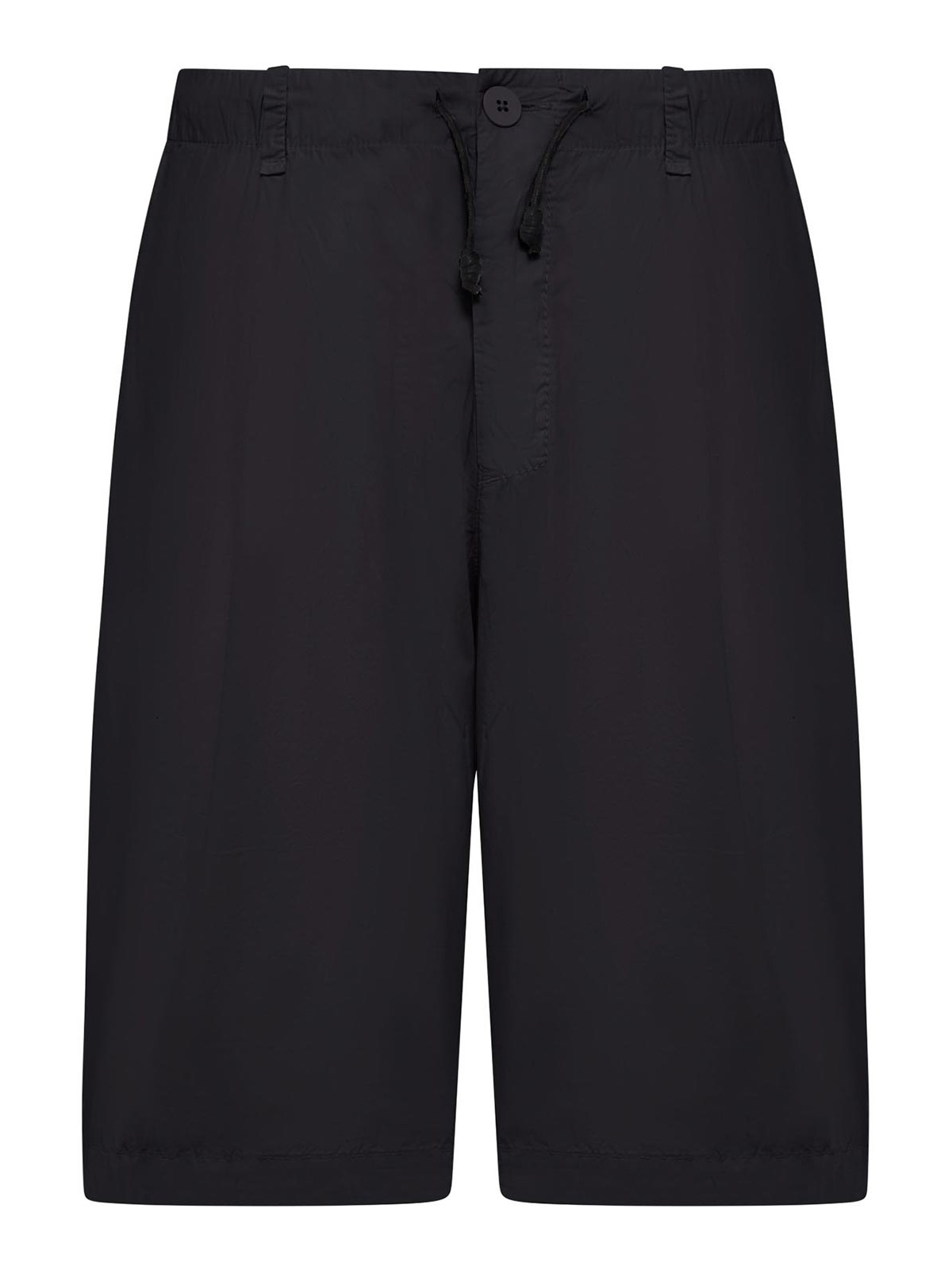 調節可能なドローストリング付き伸縮性ウエスト、フロントボタン留め、ベルトループ、インセットサイドポケット、バックパッチポケット、ストレートレッグ、ストレートヘム、レギュラーフィット、膝丈、100% コットン、色:黒