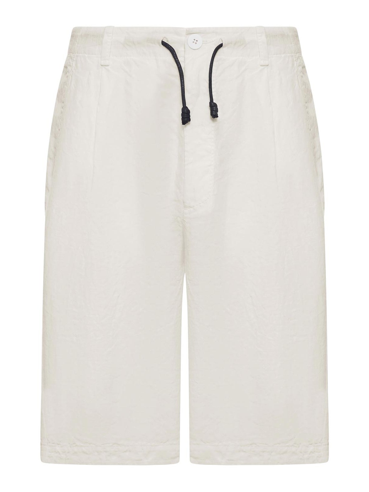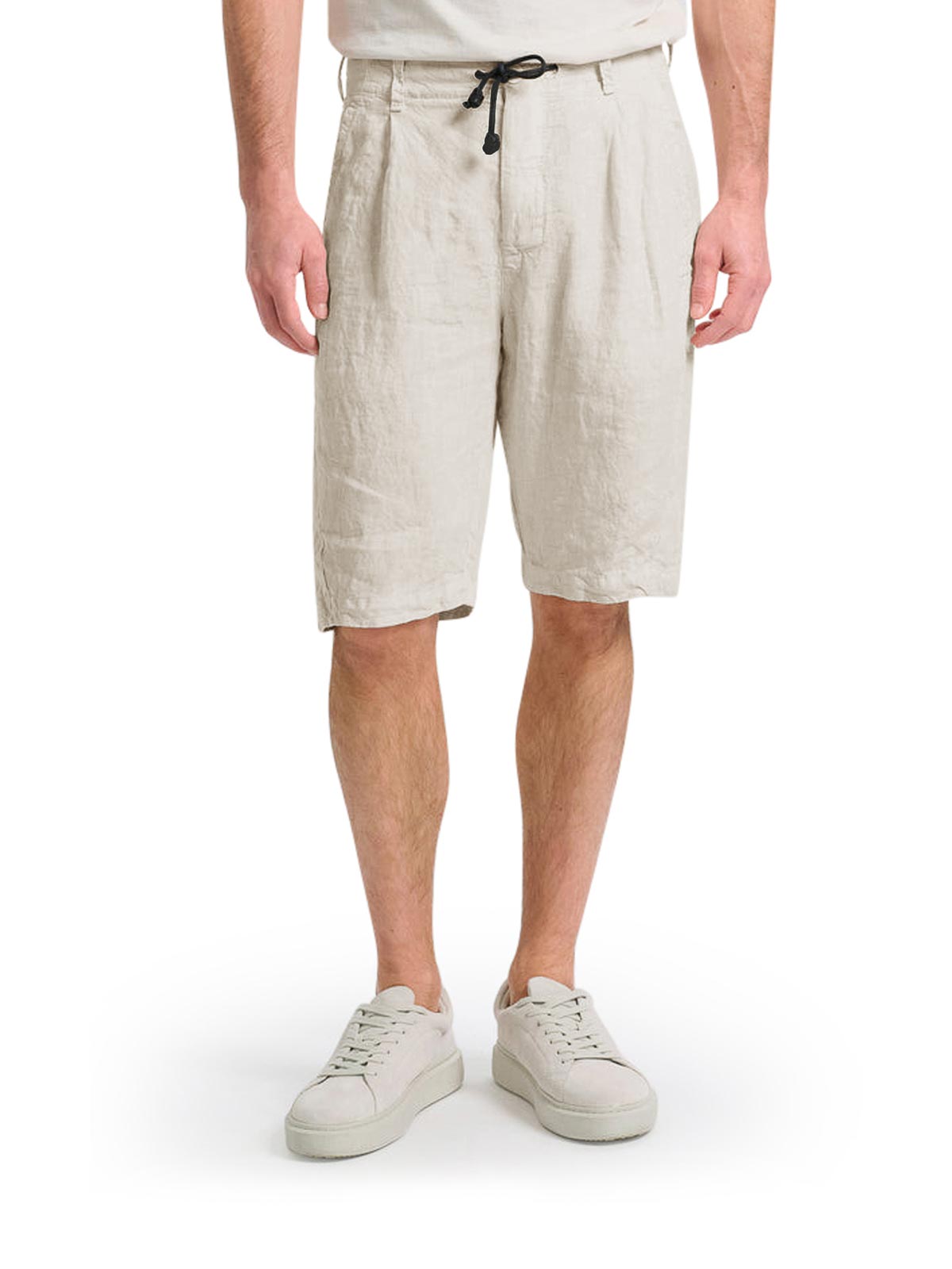 ベルトループとドローストリング付きウエスト、カバーフラップ付きフロントボタンクロージャー、インセットサイドポケット、バックウェルトポケット、ワイドレッグのレギュラーフィット、トーン・オン・トーン・ステッチ仕上げのストレートヘム、100% リネン、色:ストーン