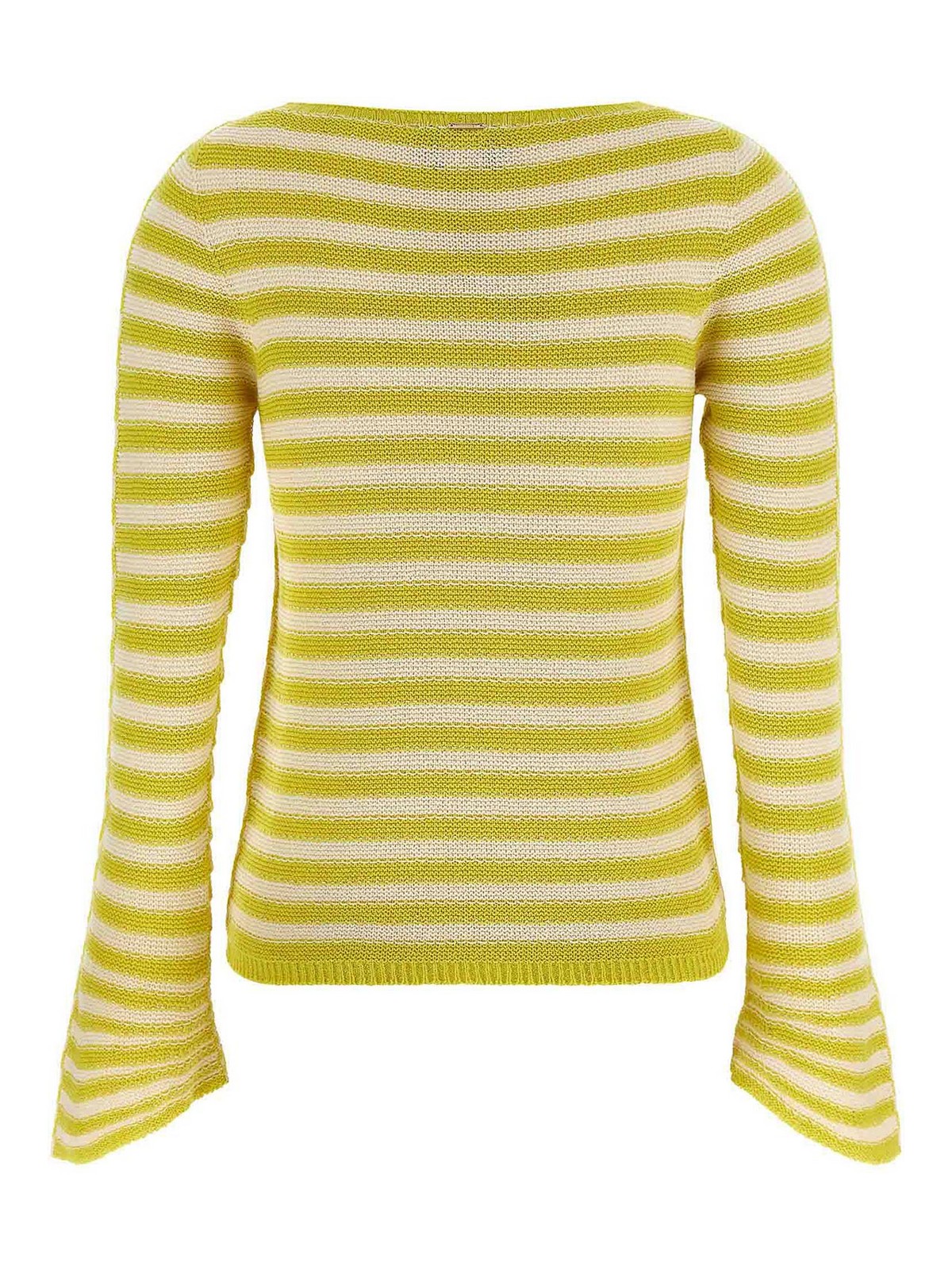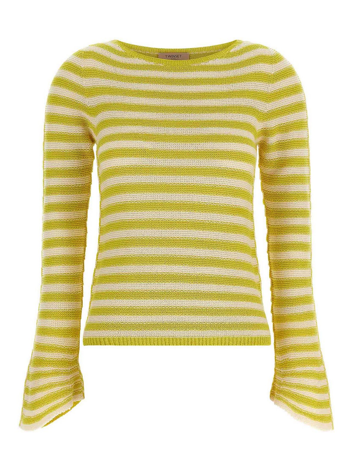 ストライプ柄のコットン混紡セーター、クルーネック、裾にフレアをあしらったロングスリーブ。