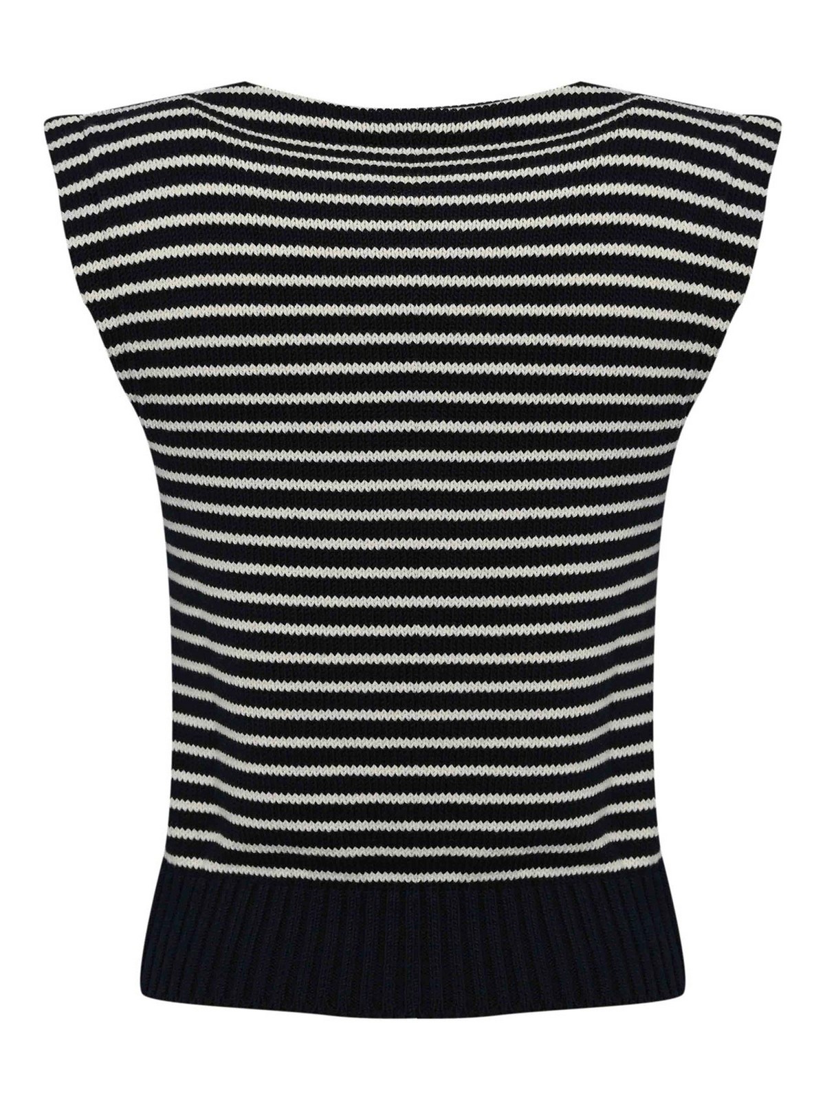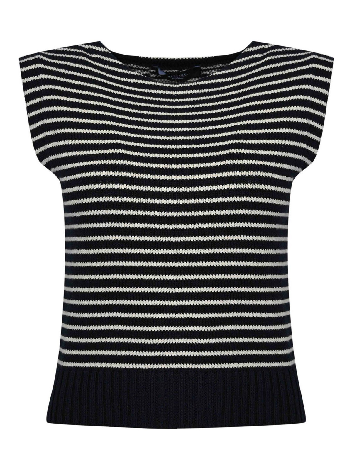 女性用コットンヤーンベスト、ウィークエンドマックスマーラ、WKDLANDAモデル、生地:コットンヤーンニット、パターン:水平ストライプ、袖:ノースリーブ、襟:クルーネック、クロージャー:なし、ポケット:なし、ディテール:リブボトム、ストッキネットステッチ、裏地:いいえ、フィット:レギュラー