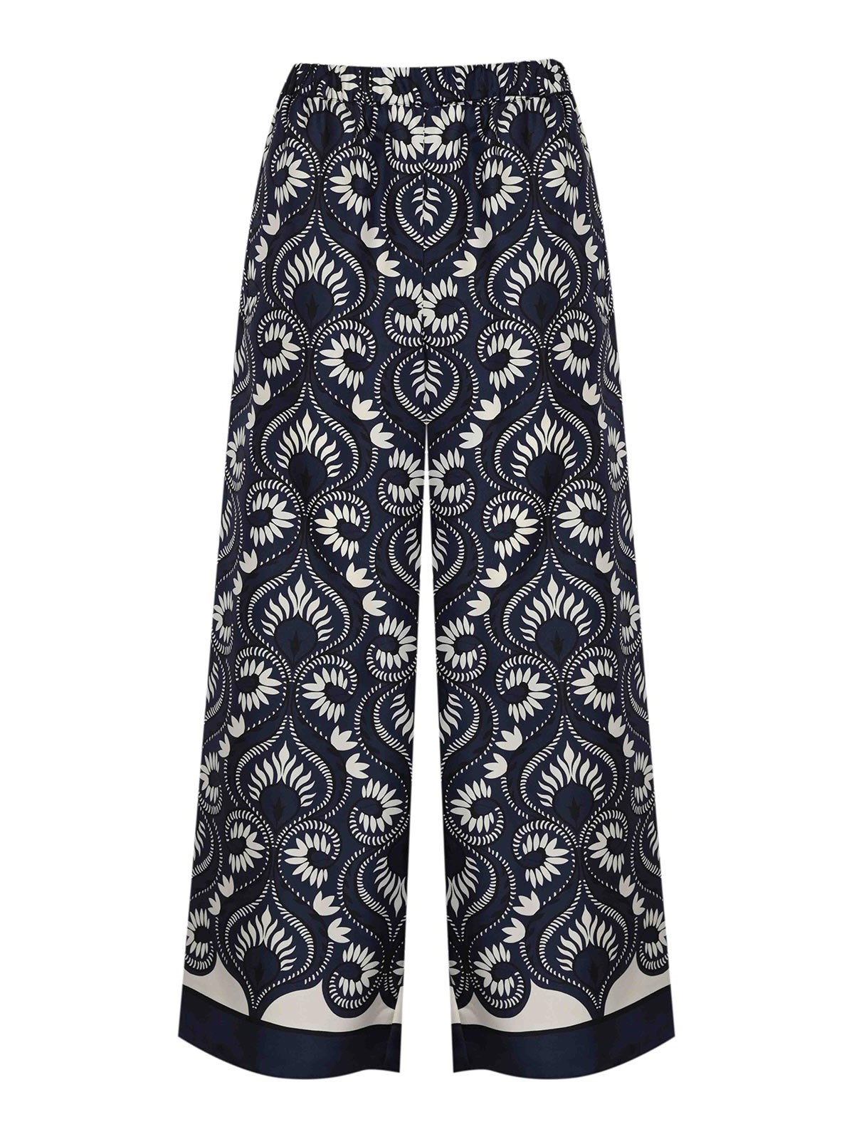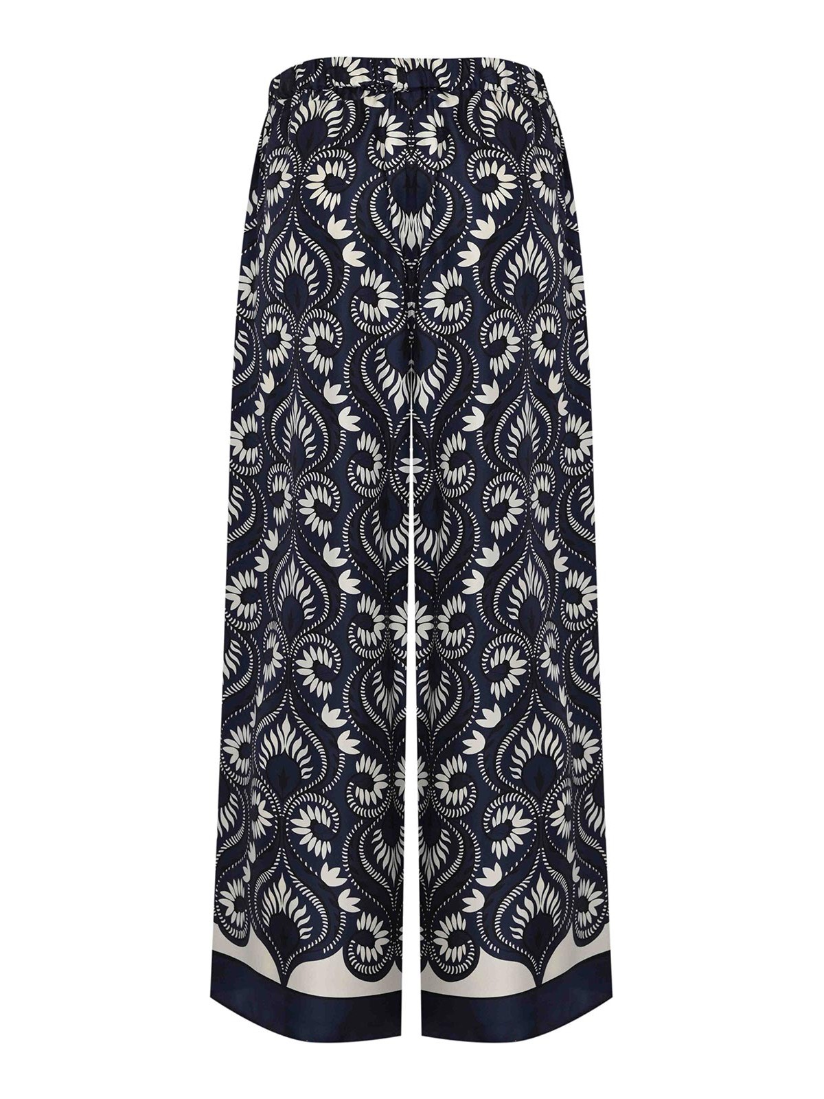 女性用プリントシルクパンツ、ウィークエンドママ、wkdotticoモデル、生地:シルク、パターン:オーナメンタルプリント、ウエスト:Mサイズ(ゴム入り)、クロージャー:クロージャーなし、ポケット:サイド、長さ:ロング、ディテール:ボトムにコントラストの効いたエッジが付いたフルードワイドレッグ、裏地:なし、フィット:ソフト