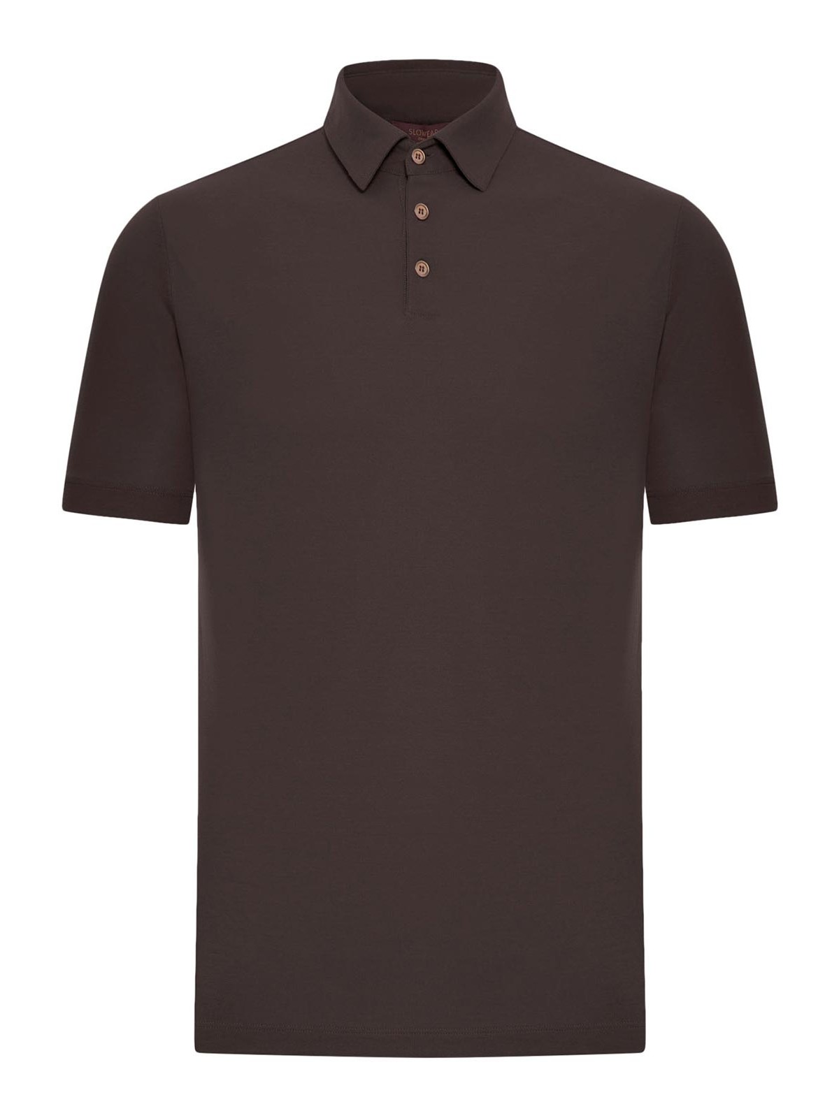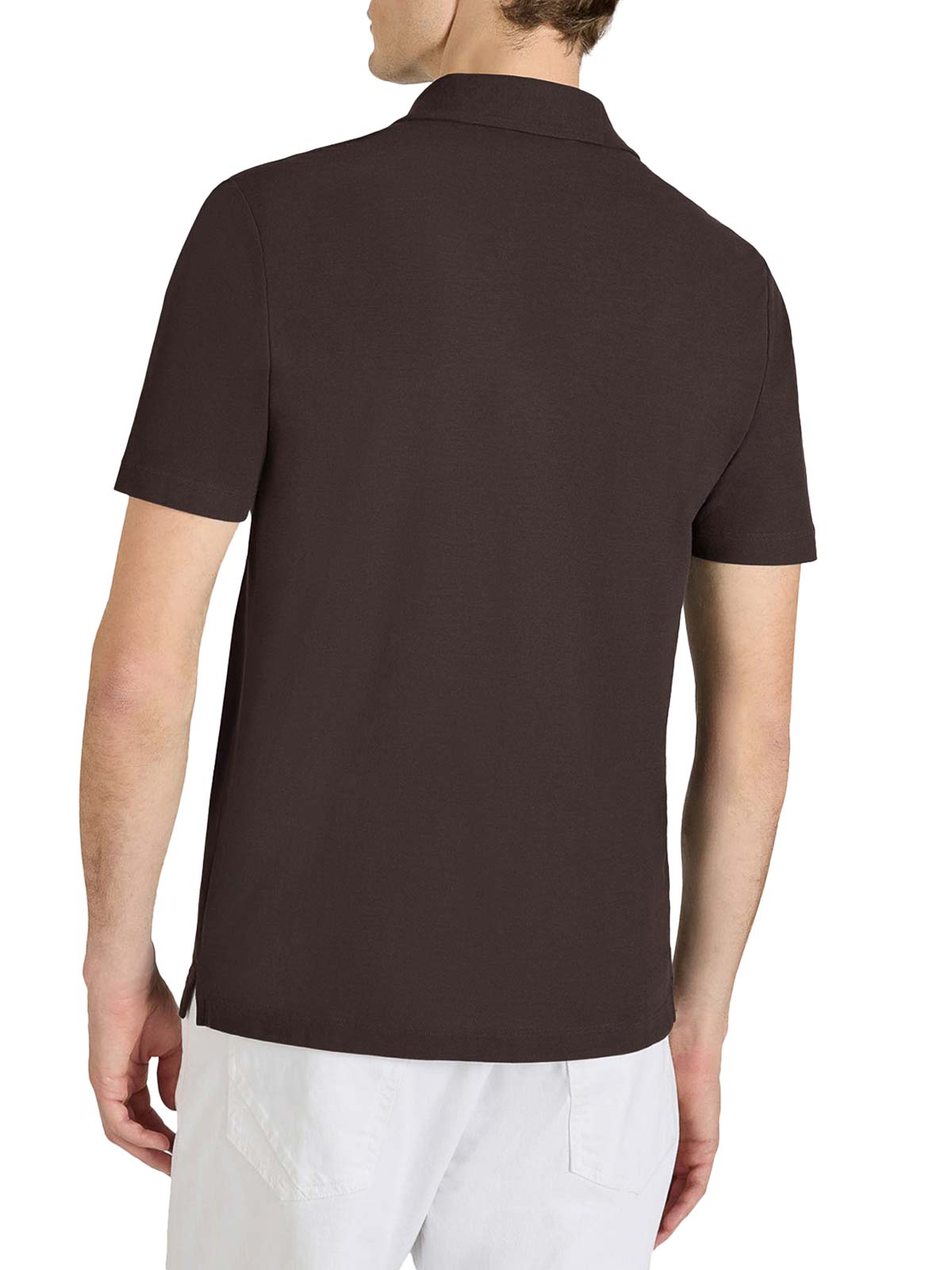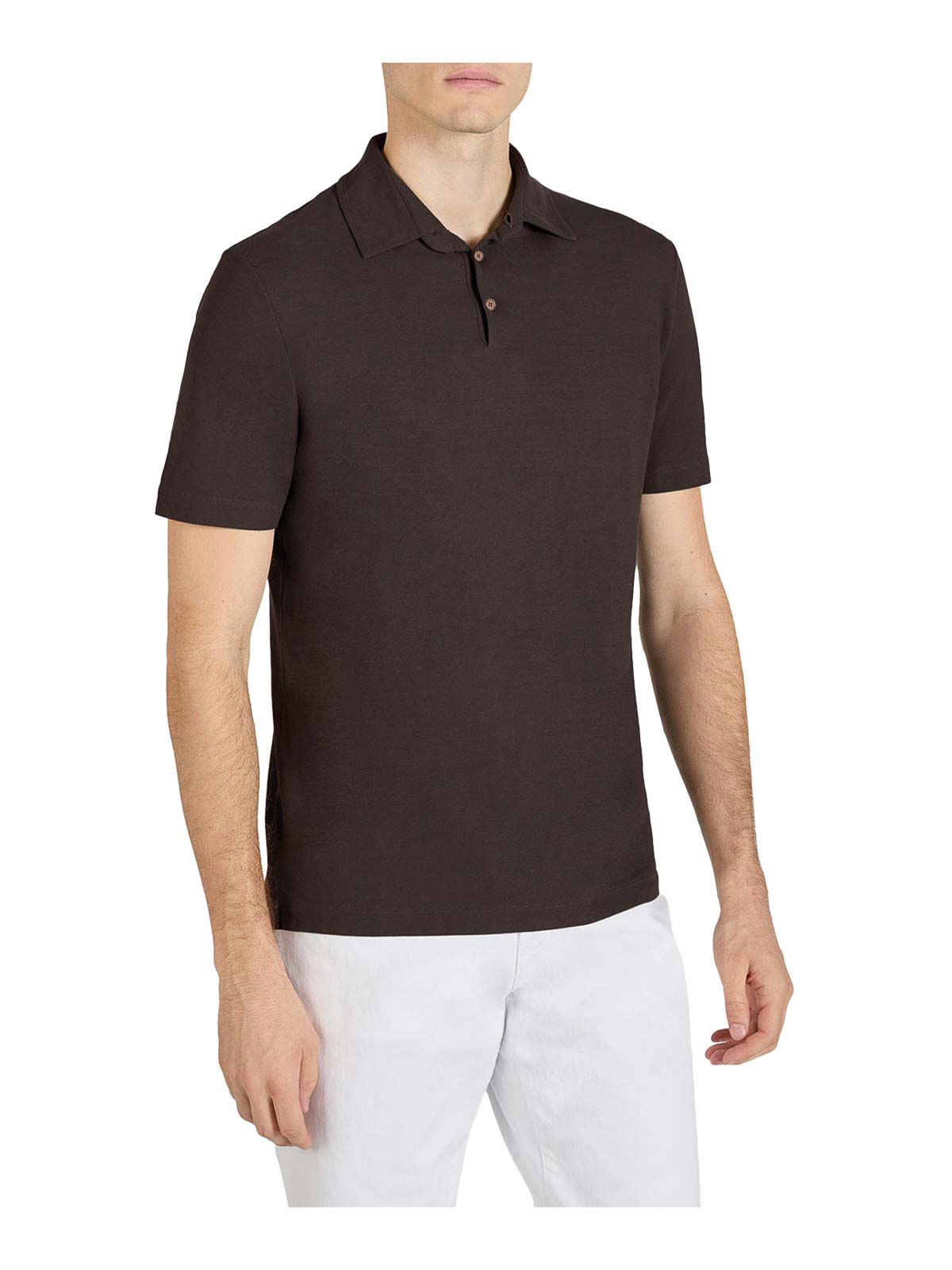 ポロカラー、3ボタンフロントクロージャー、ショートスリーブ、ストレートヘム、リブ付きトリム、スリムフィット、アイスコットン製、丈夫で軽量、通気性のある構造の専用糸、優れた体温調節機能、アイスコットン 100%、色:チョコレート