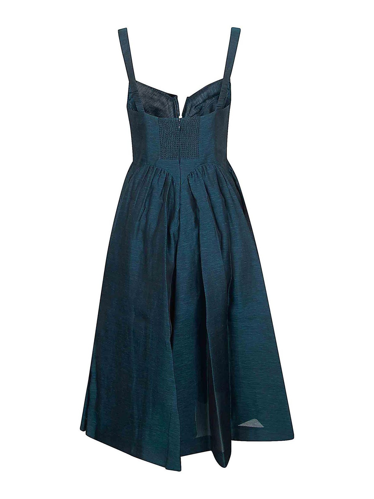 e di zimmermannによるオーガンザのRebellionドレス。バストに垂れ下がったスイートハートネックラインで、ストラップとバックスカートに伸縮性のある補強材が付いており、ロングでフレアなデザインです。