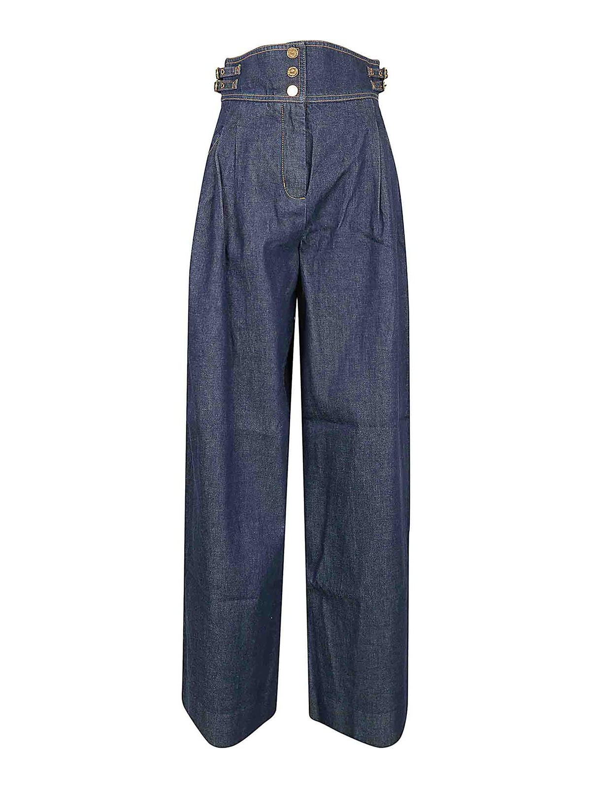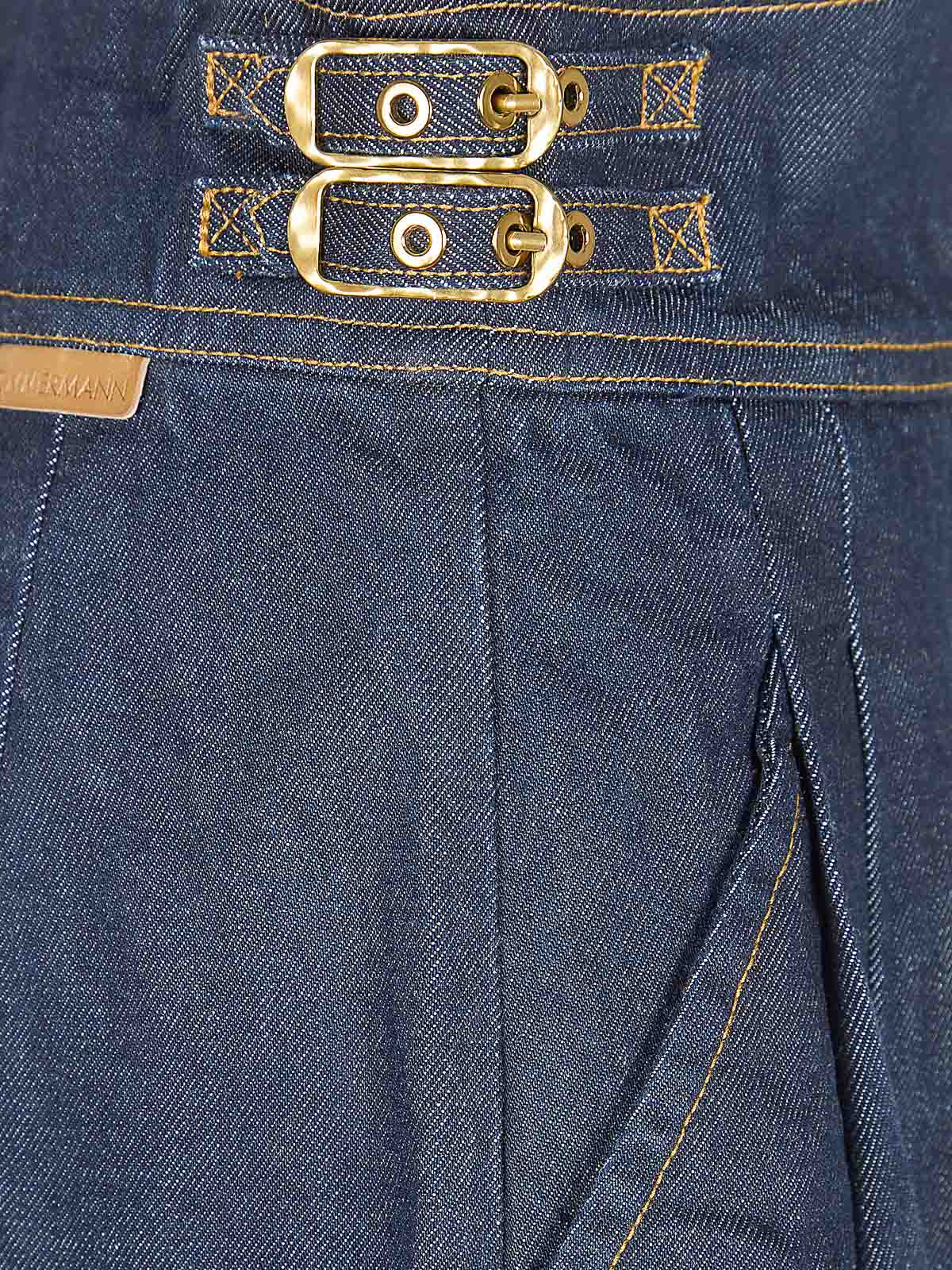 ZimmermannのRebellionテーラードデニムパンツ。ハイウエストのフラップ付きで、サイドポケットの中央に金色のボタンが付いています。幅広のデザインにはダーツが入っており、裾はフレアになっており、衣服全体に装飾的なステッチが施されているのが特徴です