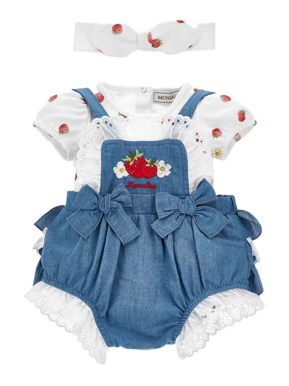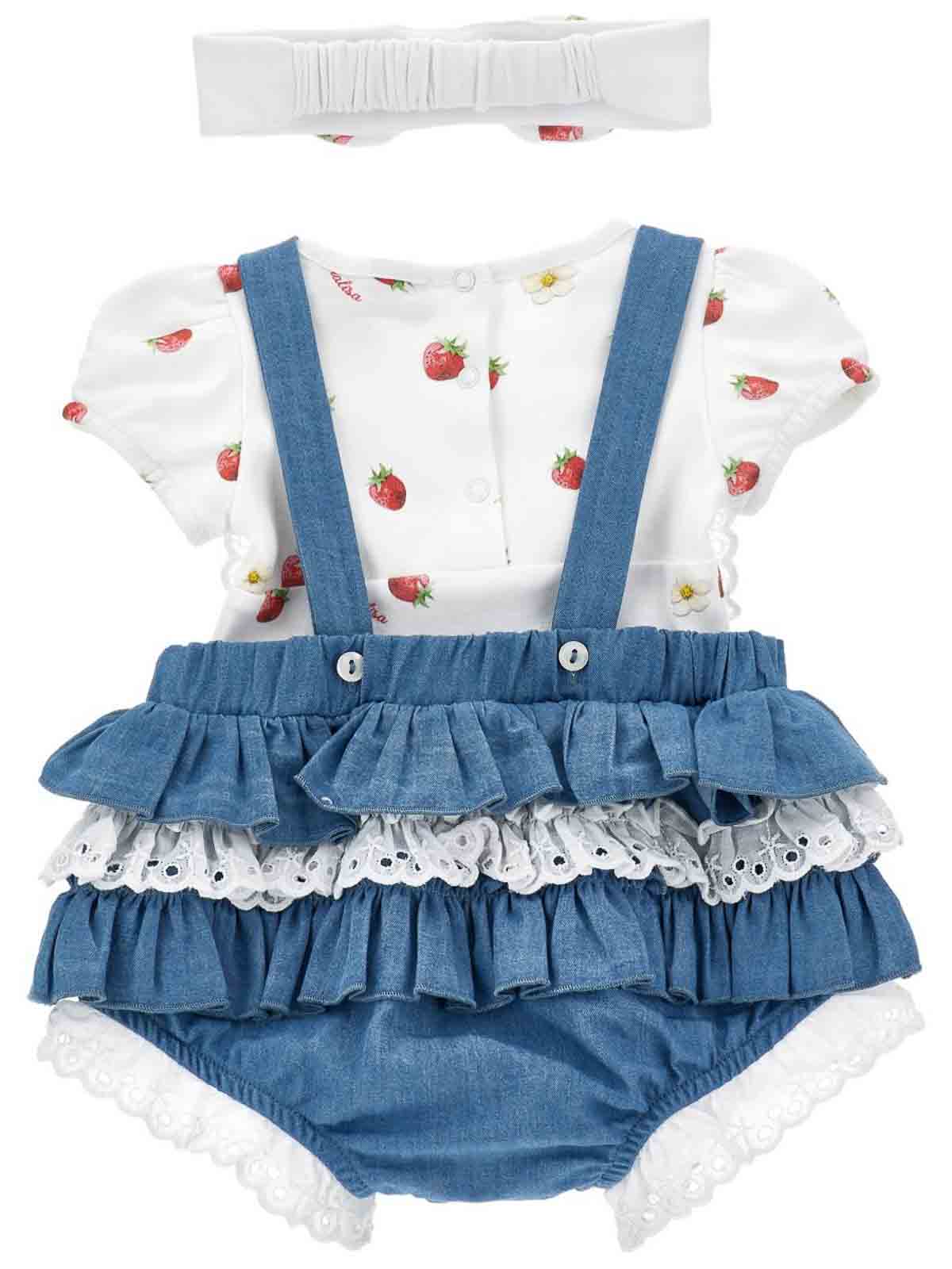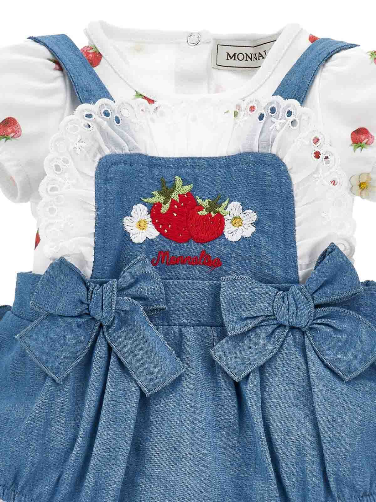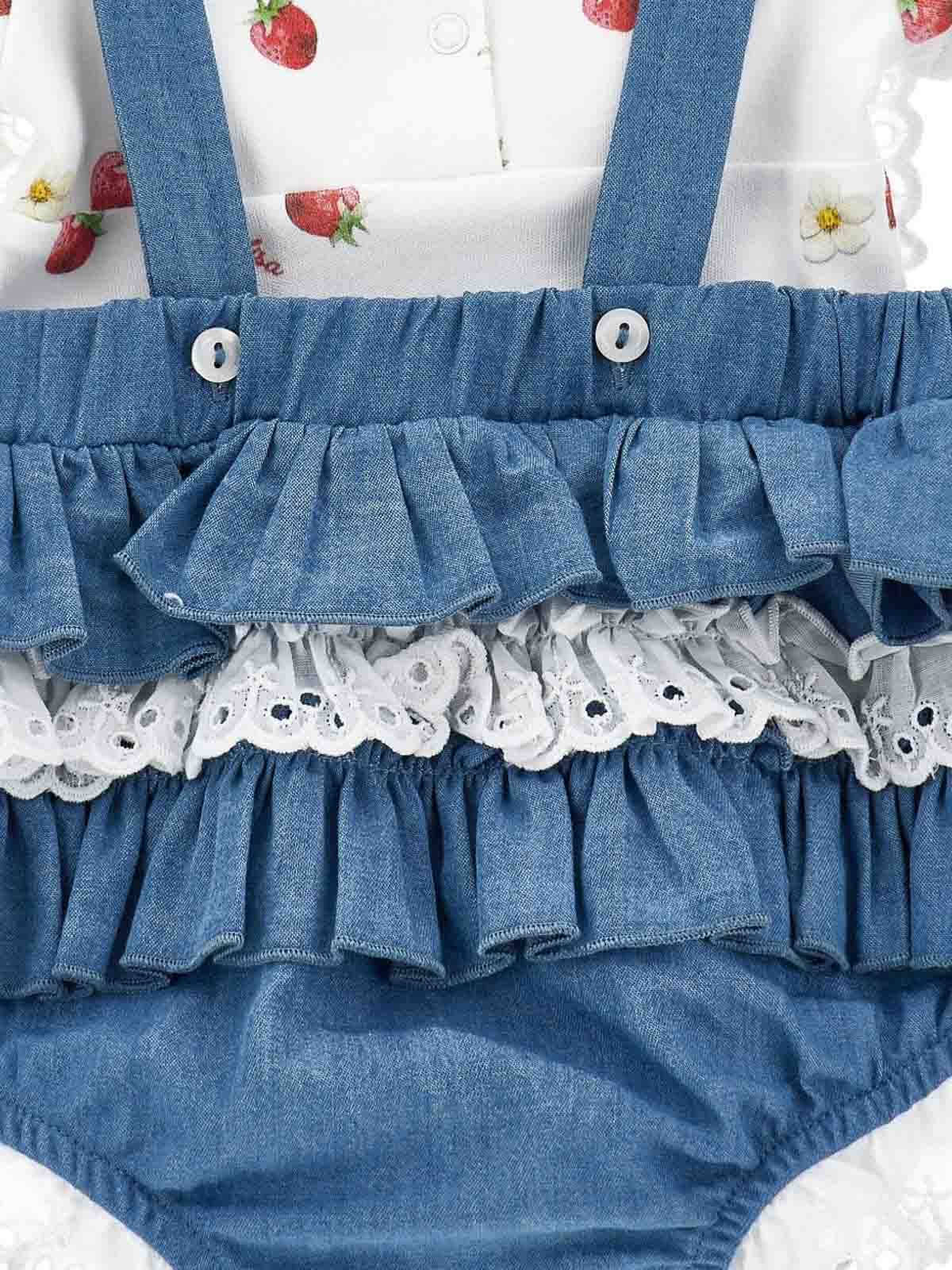 Set of pieces with logo denim romper with ruffles and bows logo sewn on the front adjustable strap with buttons strawberry print t-shirt with buttoning on the back