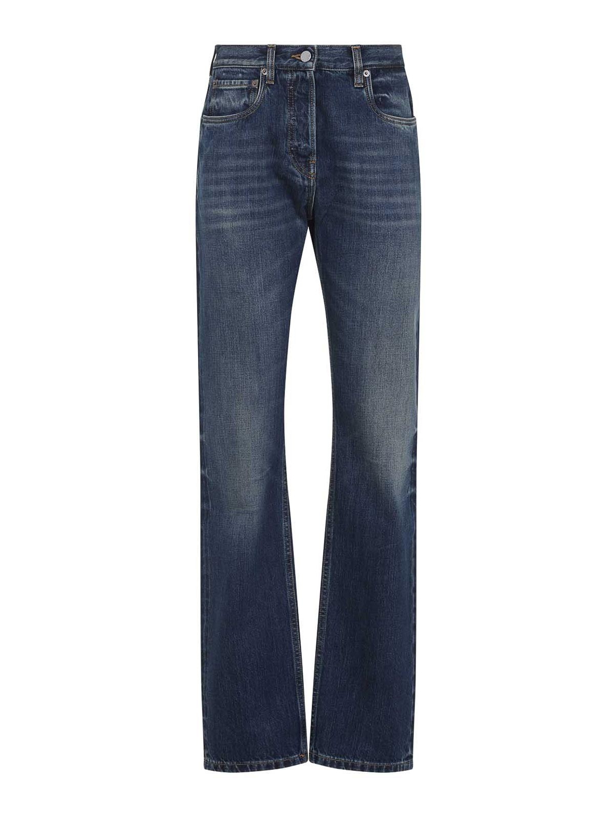 Prada blue cotton jeans. crafted from bleached cotton denim, low-waist, belt loops, front button and fly-zip fastening, 5-pocket design, branded leather label at the back waist, tapered fit.
