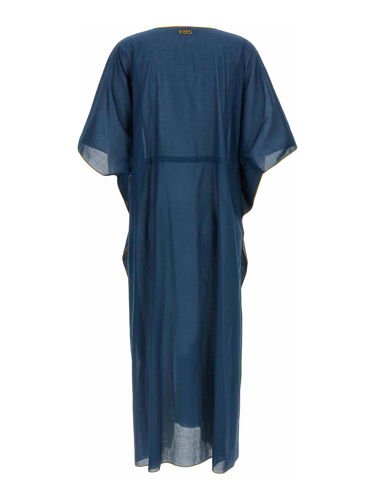 Long 'voilier' cotton voile dress with contrast piping, caftan style, underbust drawstring, v-neck, wide short sleeves.