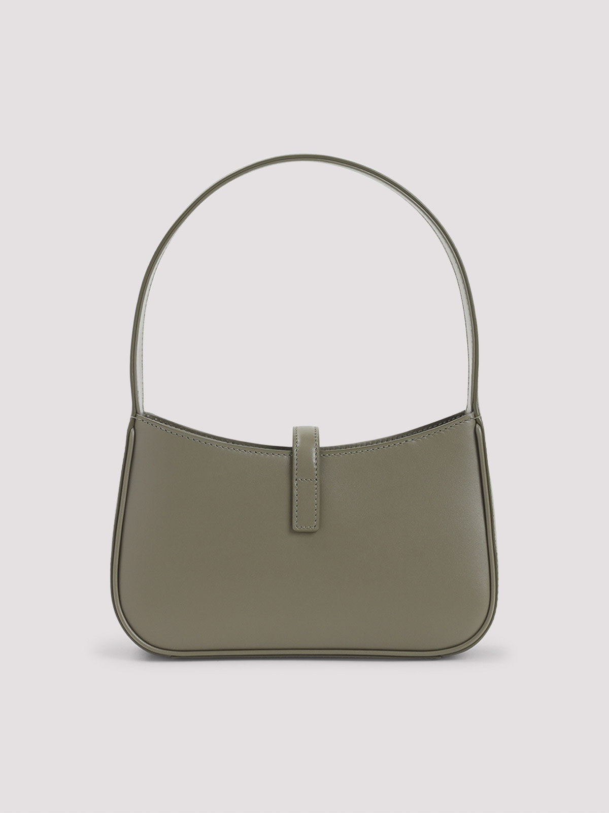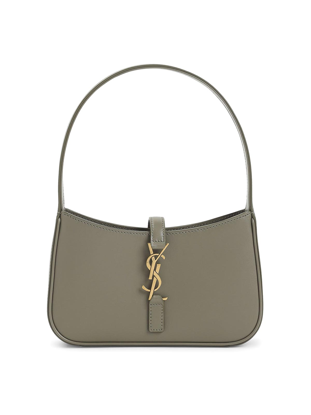 Saint laurent strong moss leather le 5 7 mini bag. crafted in pure strong moss leather. hobo construction, top handle, strap closure with ysl logo hook fastening, one main compartment, one inner card slot, gold-toned brass hardware, lined.