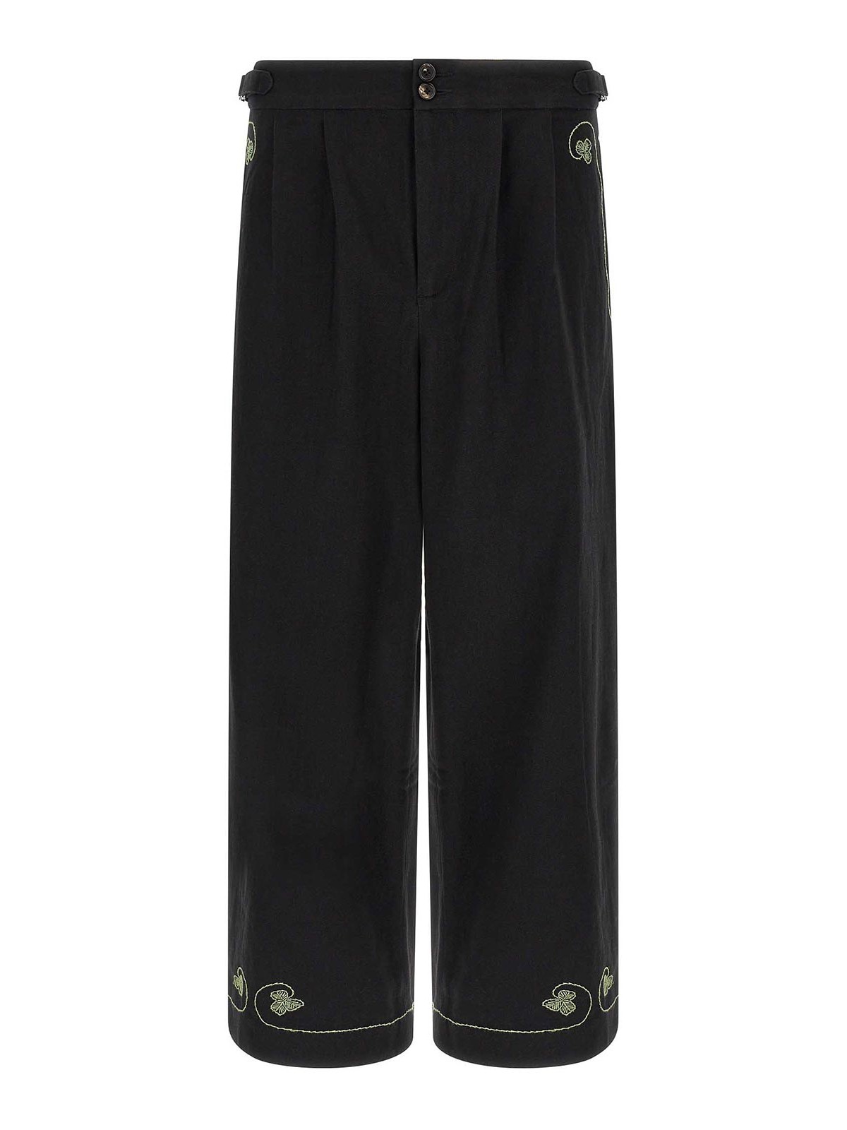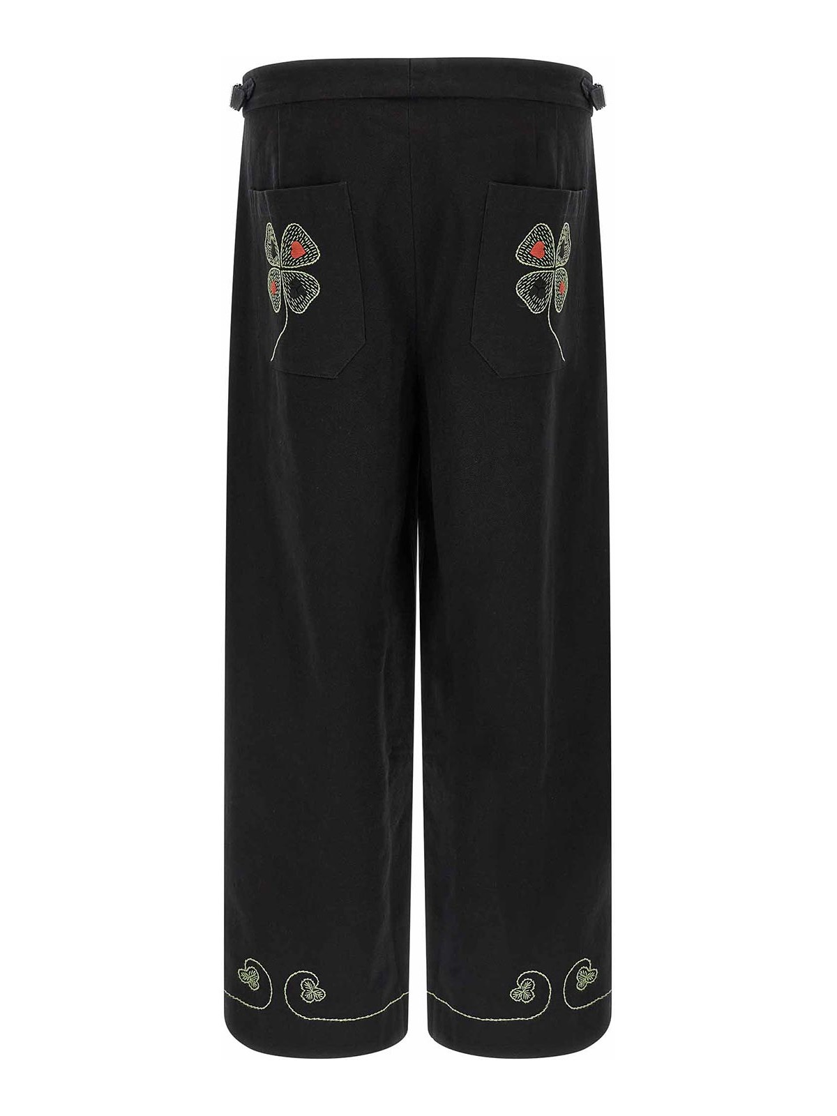 lucky draw' cotton twill pants with clover embroidery and handmade playing card seeds, crop model, wide and straight leg, pleats, mid waist, front zip and button closure, front american pockets, back welt pockets.