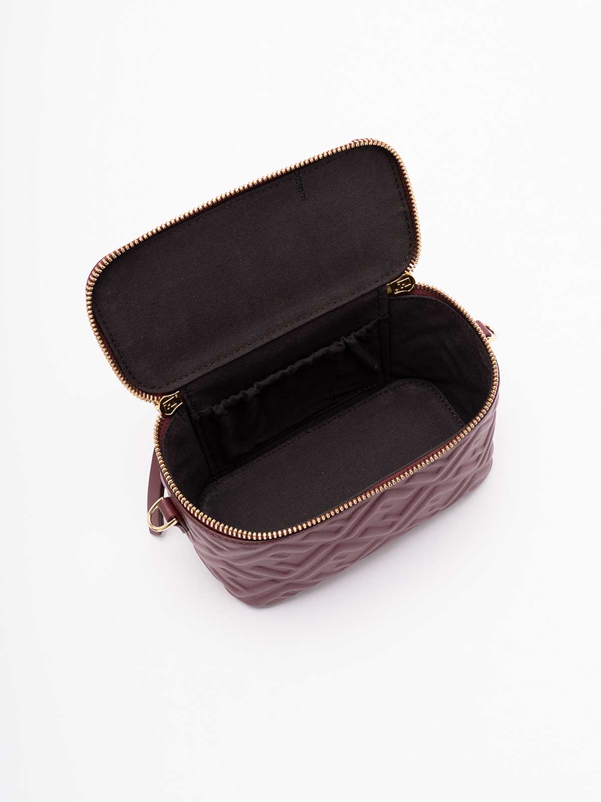 Compact vanity case with zip closure and functional interior. Finished with iconic tone-on-tone details.