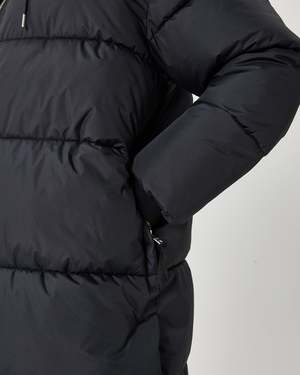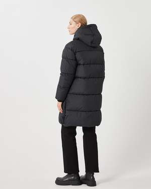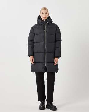 A midi duvet jacket crafted from recycled polyester. The jacket has a relaxed fit and features a hood, a zipper closure, elastic at the sleeve edges and slits along the side with a button closure. The model is 180 cm tall and wears a size 36. 100% polyester - recycle