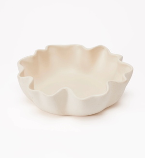 The Veda Catchall is a small, unglazed ceramic dish with a matte finish. Its ruffled edge and soft texture make it suitable for holding jewelry, keys, or other small personal items. The dish is designed to complement larger decorative pieces. Microwave safe for convenient reheating. Oven safe up to 180 degrees Fahrenheit for versatile use. Hand-wash recommended with mild soap; avoid abrasive cleaners.