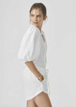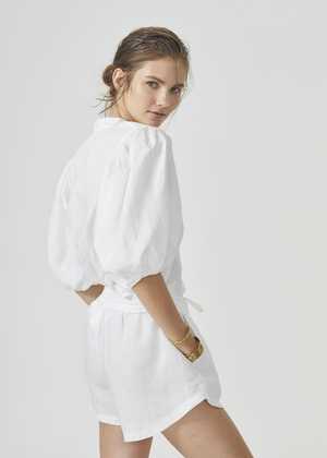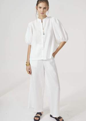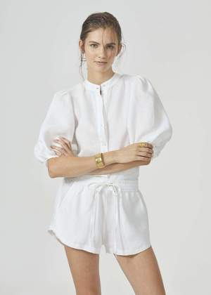 - White button up shirt with bubble sleeves - 100% organic linen - Mao neck - Elbow-length balloon sleeves - Button front closure - Pre-washed and softened SIZE NOTES - Model wearing size XS SUSTAINABLY MADE - From Lanhtropy (Key Biscayne, Florida) - Sustainable Values: #3: Sustainable materials, #4: Natural and organic ingredients, #8: Longer lifetimes, #9: No animal cruelty SUSTAINABLE CARE - Machine wash cold - Hang dry or lay flat