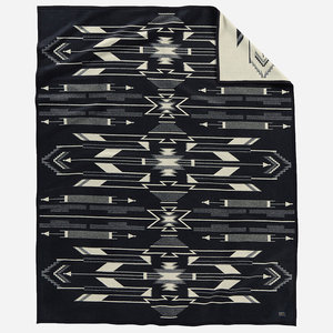 USA-made wool blanket inspired by Southwestern mythology. Tsi Mayoh is one of four sacred hills overlooking the Chimayo valley. The design references an ancient legend that supernatural beings led New Mexico's people out of a labyrinth of cold underground caves and into the sun. Unnapped; fabric is uncombed for sharper pattern definition. Felt binding. 64x 80". 82% Virgin Wool, 18% Cotton Made in USA