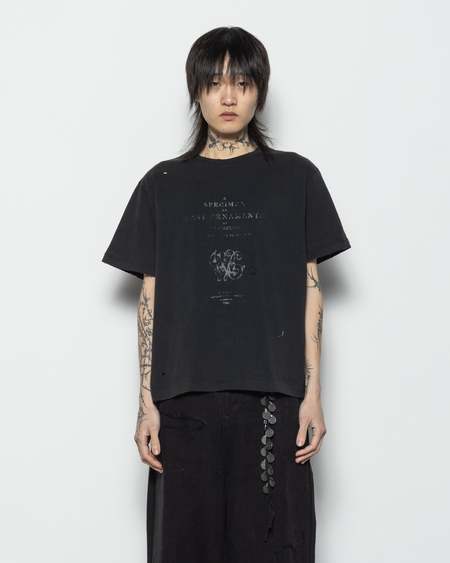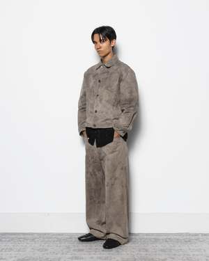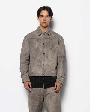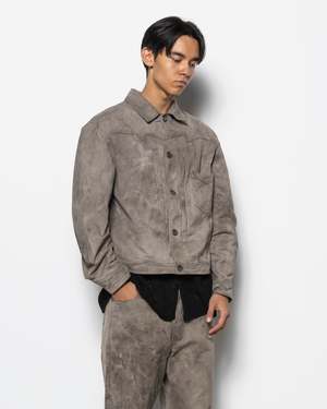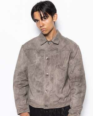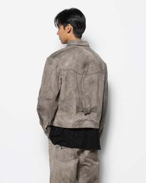 The E Denim JKT is a distressed, hand-dyed denim jacket made from a cotton construction. Each coat is unique due to the hand-dyed grey impression; no two coats are the same. Inspired by Western influences, this jacket features Western yoke stitching on the back and front, a front button closure with a pouch pocket, and a back cinch. This piece pairs with the E Denim PT for a complete outfit and western cowboy aesthetic. Shell: Random Materials. Made in Taiwan.