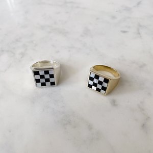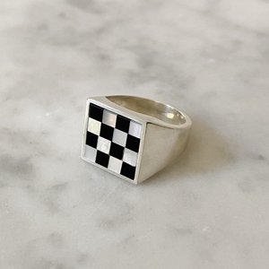 A ring youll never want to take off, our Samuel Mini ring will quickly become your go-to everyday accessory. Its unique black onyx and white mother of pearl checkered design can easily be paired with your favorite summer outfits. Whether your heading to a concert or on a coffee run with the girls, your look will quickly be elevated with this gorgeous piece. - 12x12mm Square Cut Black Onyx and White Mother of Pearl - No two stones are alike - Available in Sterling Silver & Yellow Brass - Made in New York City Note: we suggest that you size up a full size with this style