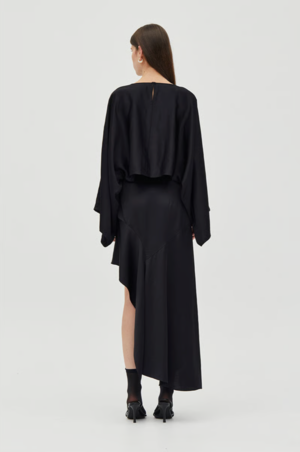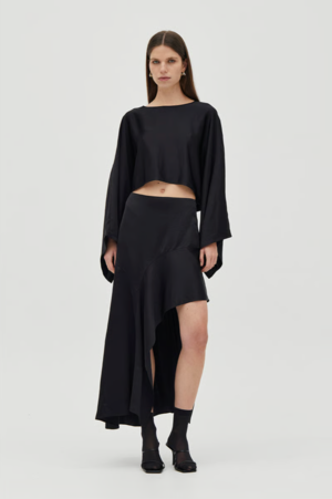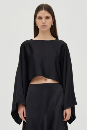 The Threshold Top is designed with oversized proportions and a mid-waist length. Exaggerated cape-like sleeves fall from the shoulder, creating easy movement without feeling overworked. Relaxed and understated, its an effortless piece that styles back to everything. - Designed to sit at the mid waist - Oversized proportions with exaggerated cape-like sleeves - Regular neckline - Back neck keyhole with button and loop closure - Finished with French seams - Fits true to size - Length: 45cm - Liv is 179cm tall and wears a size US 4 Main: 52% Viscose 43% Lyocell 5% Linen - Subtle slub texture with a natural finish - Sateen finish - Fluid drape over the body - Cold hand wash
