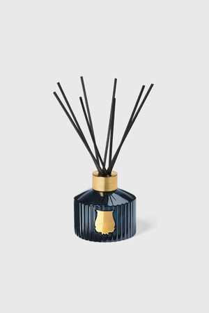 The Belle Matiere Reggio Diffuser by Trudon features a scent inspired by mandarin trees from the Mediterranean, with head notes of grapefruit and heart notes of mandarin essential oil. The 350ml fluted blue glass vessel is adorned with a gold emblem and topped with a 100% recyclable aluminum ring. Includes 8 natural black rattan sticks for passive diffusion lasting 3 to 4 months.