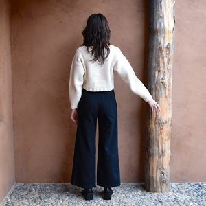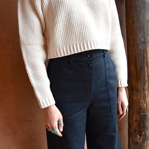 The crop pullover was hand loomed in a mid weight seed stitch using a luxurious and slightly glossy pima cotton yarn. It is styled with an open neckline and a boxy cropped fit through the body and loose shoulders that taper into a more fitted sleeve at the wrist. The perfect layer for Fall! Sizing + Details → - 100% Pima Cotton - Made In Peru - Dry Clean / Spot Clean - Fits True To Size - Model Is 5'9" And Wears Small S — Bust: 19", Length: 17", Sleeves: 19.25" M — Bust: 20.5", Length: 17", Sleeves: 19" L —Bust: 21", Length: 17", Sleeves: 19.25"