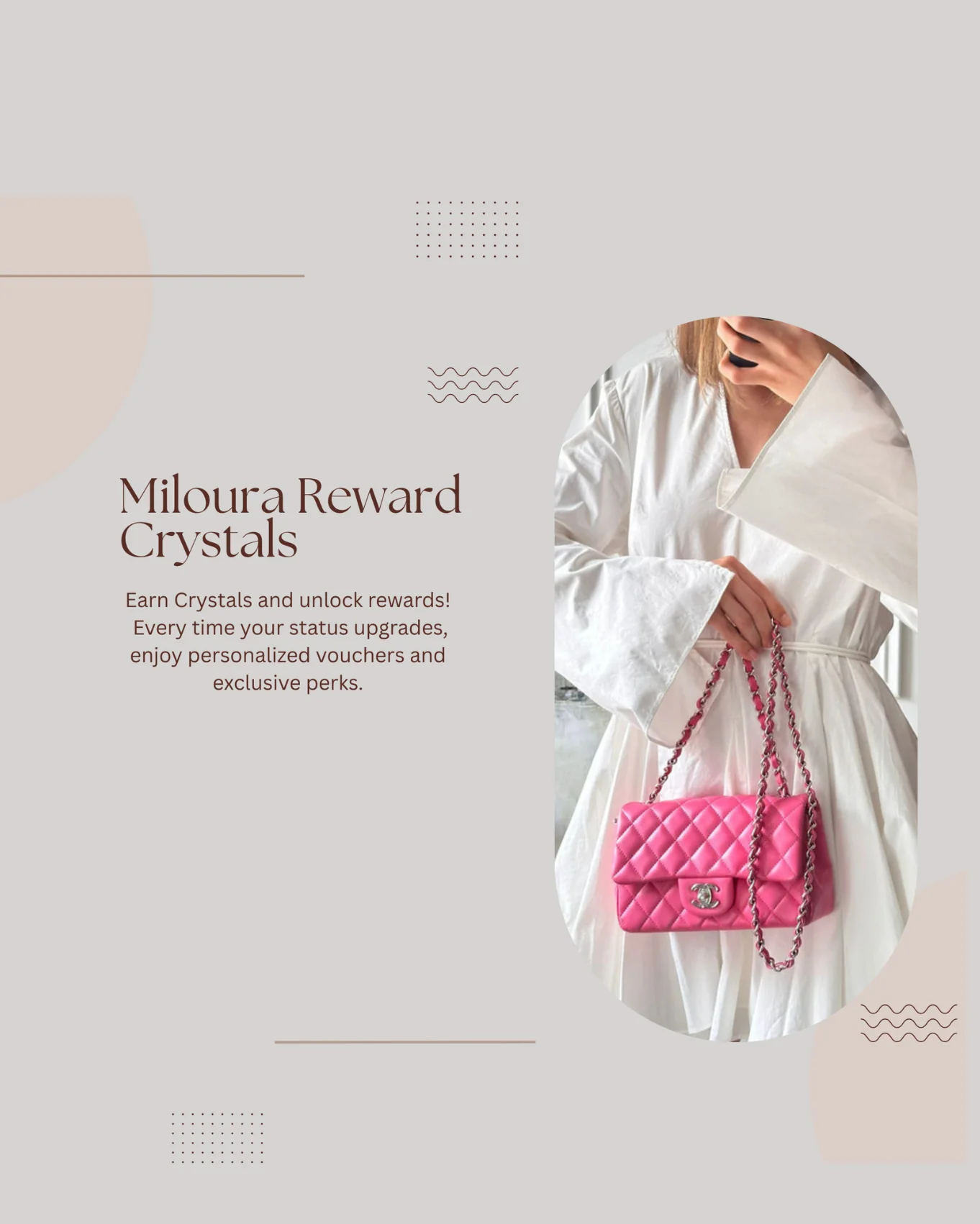 Miloura Gleams ist unser exklusives Prämienprogramm, mit dem wir uns für Ihren Einkauf von Secondhand-Luxusartikeln bedanken möchten. Jeder Einkauf bringt Sie besonderen Vorteilen, dem frühzeitigen Zugriff auf seltene Stücke und exklusiven Mitgliederprämien näher.