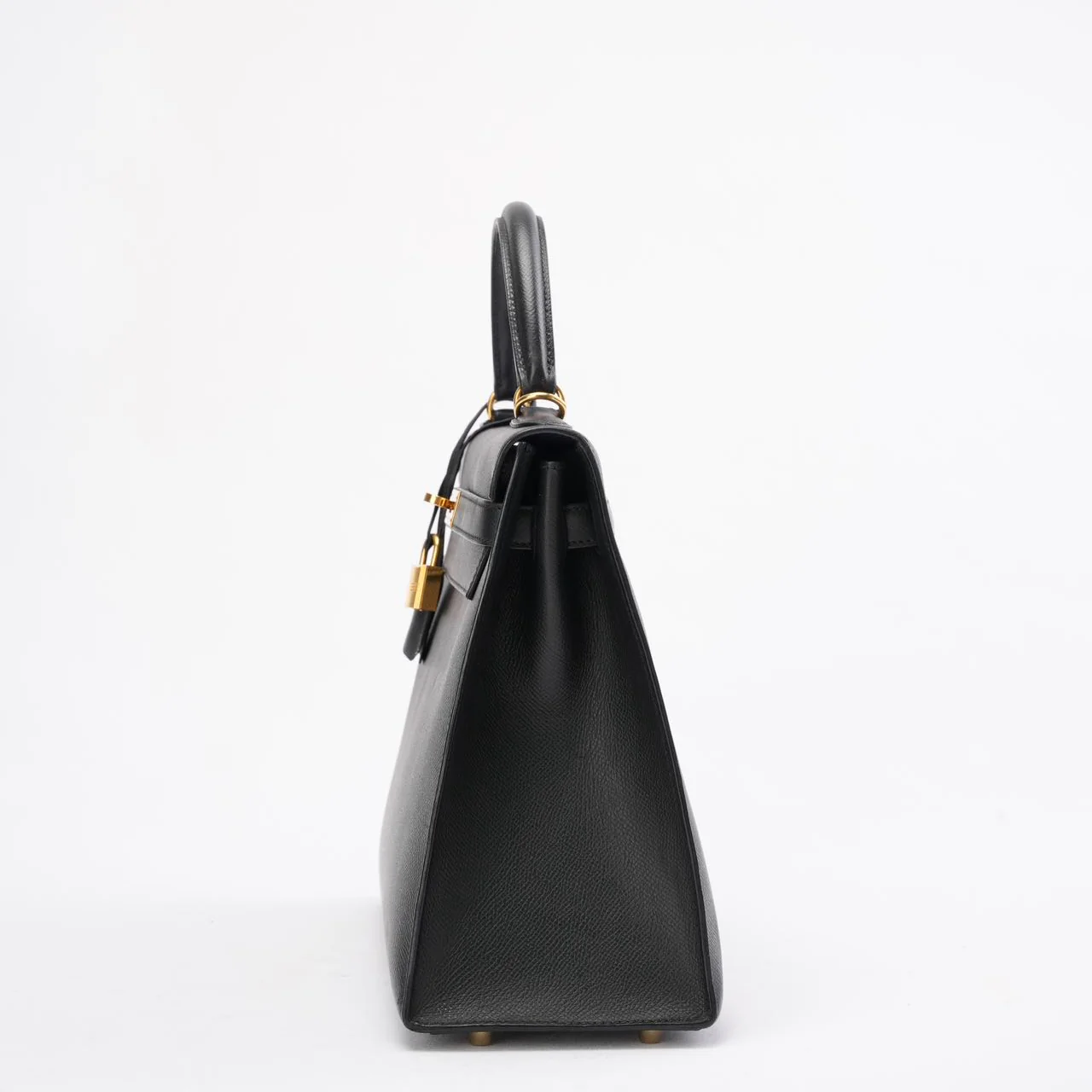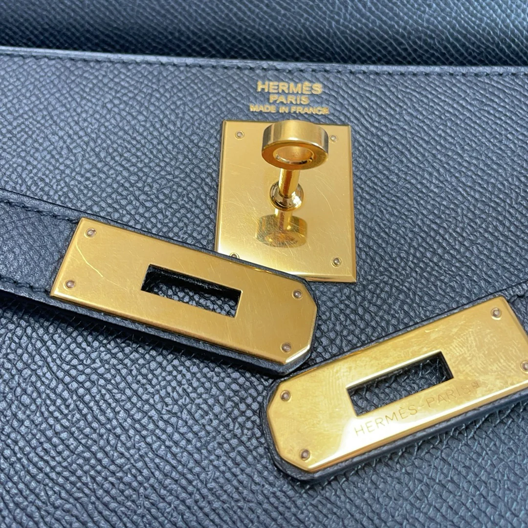 Crafted from durable Epsom leather, known for its lightweight yet rigid texture and subtle sheen, this Kelly offers both resilience and an elegant finish. The gold-plated hardware complements the black tone beautifully, adding a touch of understated luxury.