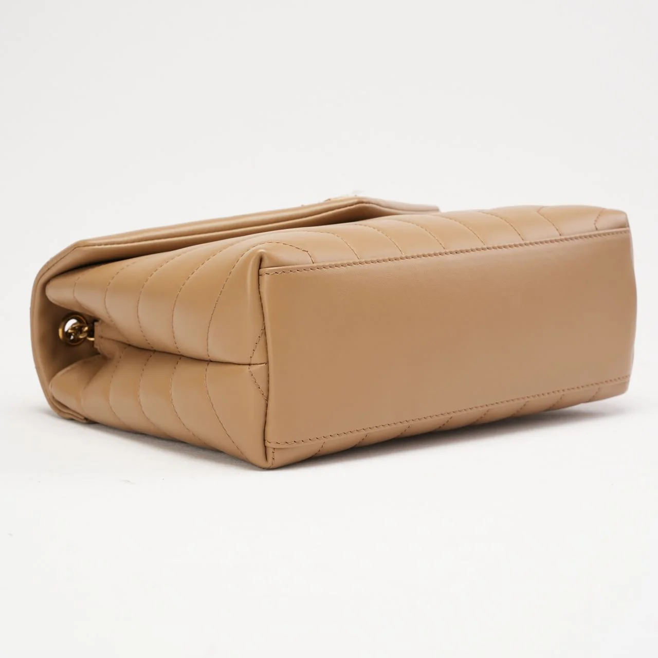 This elegant Saint Laurent Small Loulou Chain Satchel in dark beige leather with antique gold-tone hardware was produced in 2022. Crafted in soft, quilted leather, it features the iconic YSL monogram and a versatile chain-and-leather shoulder strap. The structured yet supple silhouette is complemented by a thoughtfully designed interior with multiple compartments, making it both stylish and practical for everyday use.