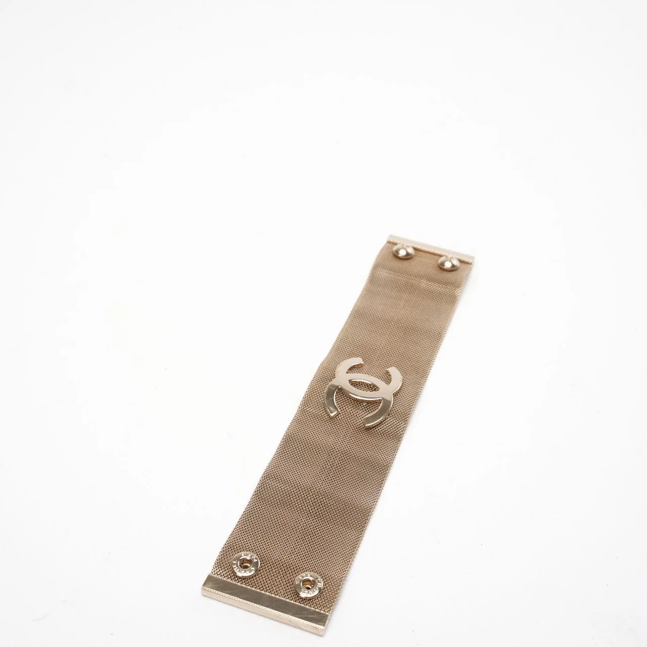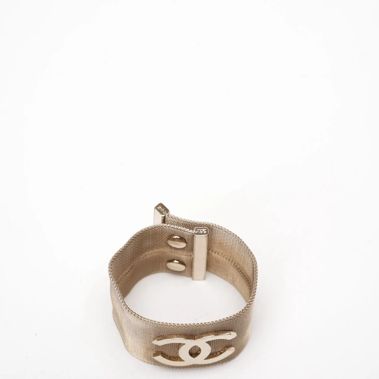 A striking Chanel accessory, this Metal Mesh CC Bracelet is crafted in light gold-tone hardware with a sleek mesh band and finished with the iconic interlocking CC logo. Elegant yet modern, it offers a versatile design that can be worn as a statement piece on its own or layered with other bracelets for a chic, stacked look.