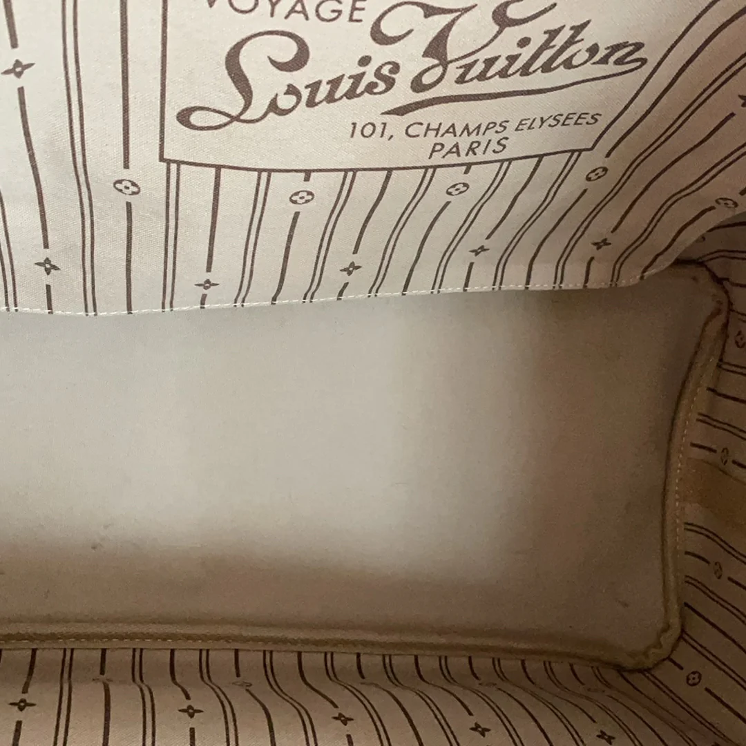 This spacious and recognisable Louis Vuitton design is the Neverfull GM Tote Bag. It is made from the brand's trademark brown monogrammed canvas and features gold-tone hardware and natural cowhide leather trim. It was produced in 2014 and features slim leather handles, a roomy, open interior, and a detachable pouch for added functionality. Perfect for everyday wear, travel, or work, it can be worn on the shoulder for a more relaxed look or by hand for a more elegant look. Because it's elegant, practical, and timeless, Louis Vuitton's Neverfull GM remains one of their most sought-after and collectible designs.