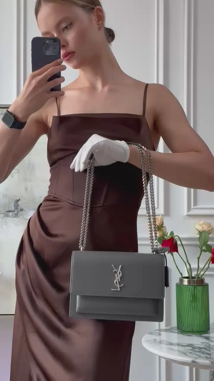 Preloved Saint Laurent Medium Monogram Sunset Bag in grey calfskin is the perfect blend of modern sophistication and timeless style. Its sleek silhouette and iconic YSL logo make it a versatile accessory for any occasion.