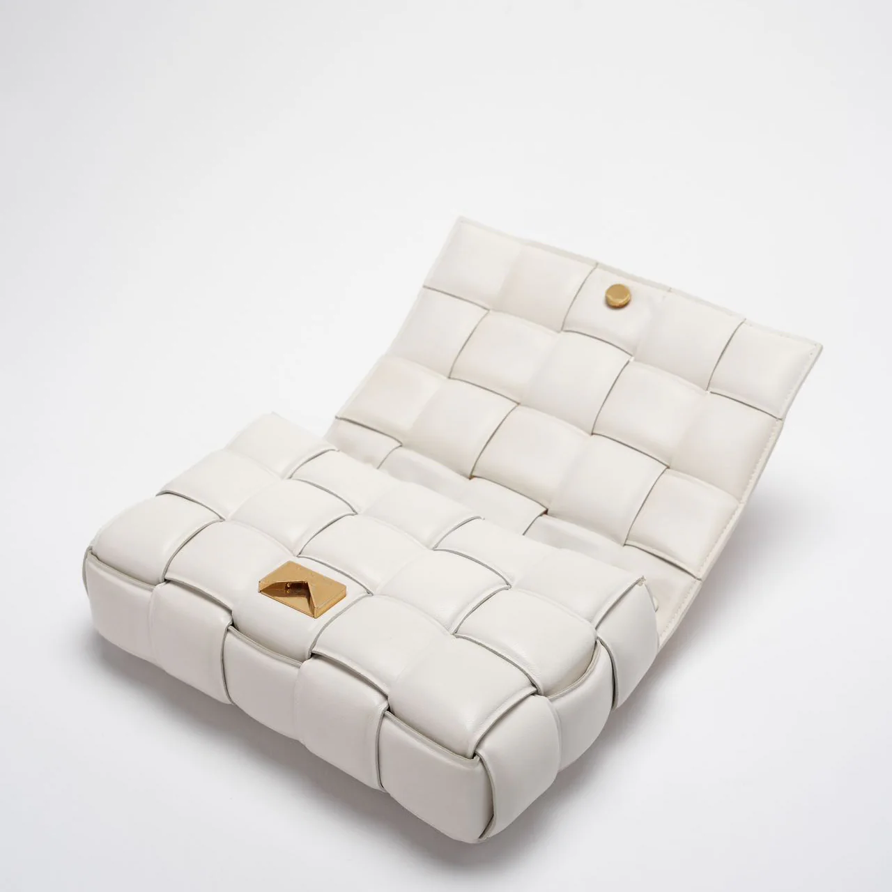 Make a bold statement with this iconic Bottega Veneta White Padded Chain Cassette Crossbody Bag, a modern classic that redefines contemporary luxury. Expertly crafted from supple lambskin leather, the bag showcases Bottega Veneta’s signature intrecciato weaving, elevated with thick, padded panels and a chunky gold-tone chain strap that adds a touch of edge and elegance.This second-hand designer crossbody bag is in excellent condition