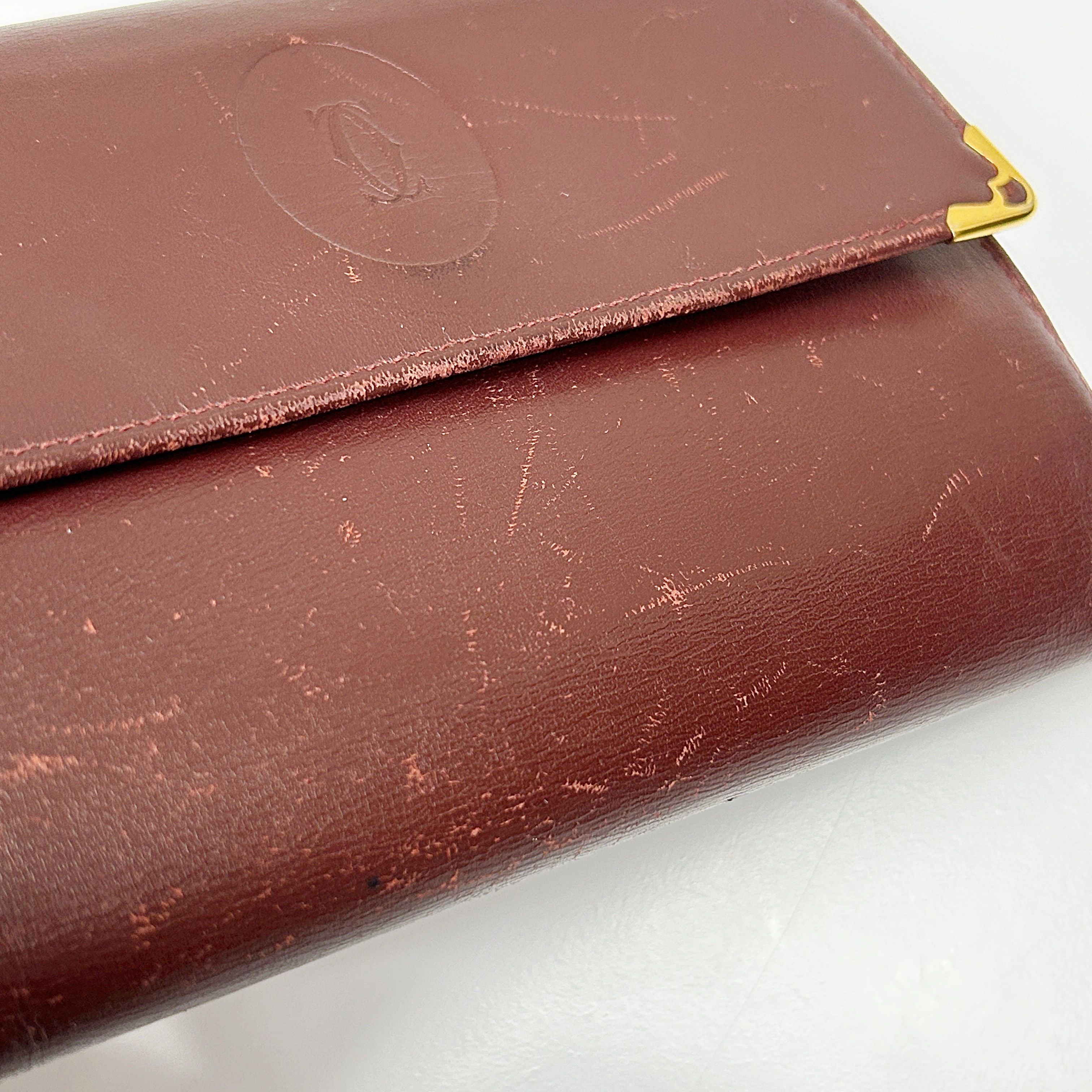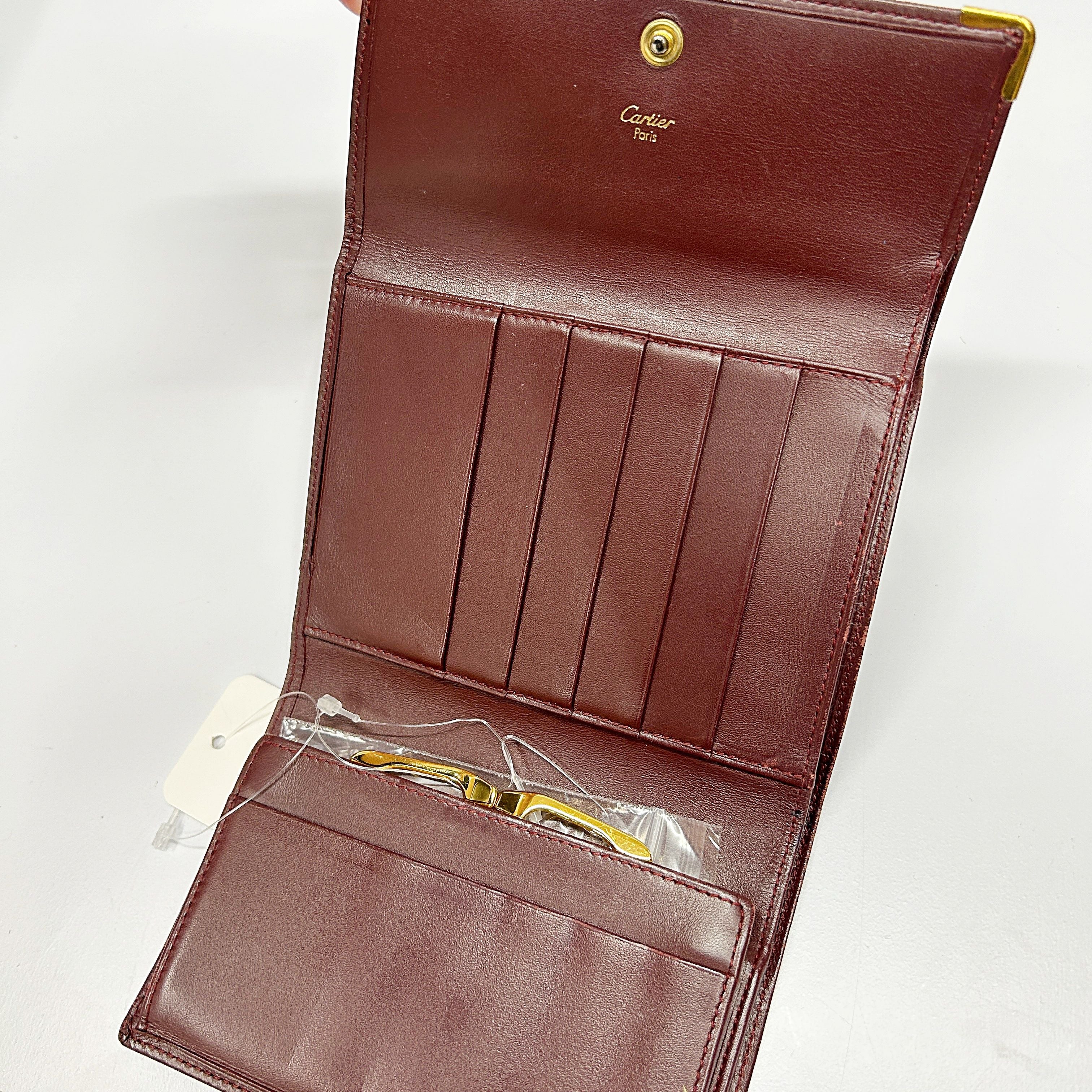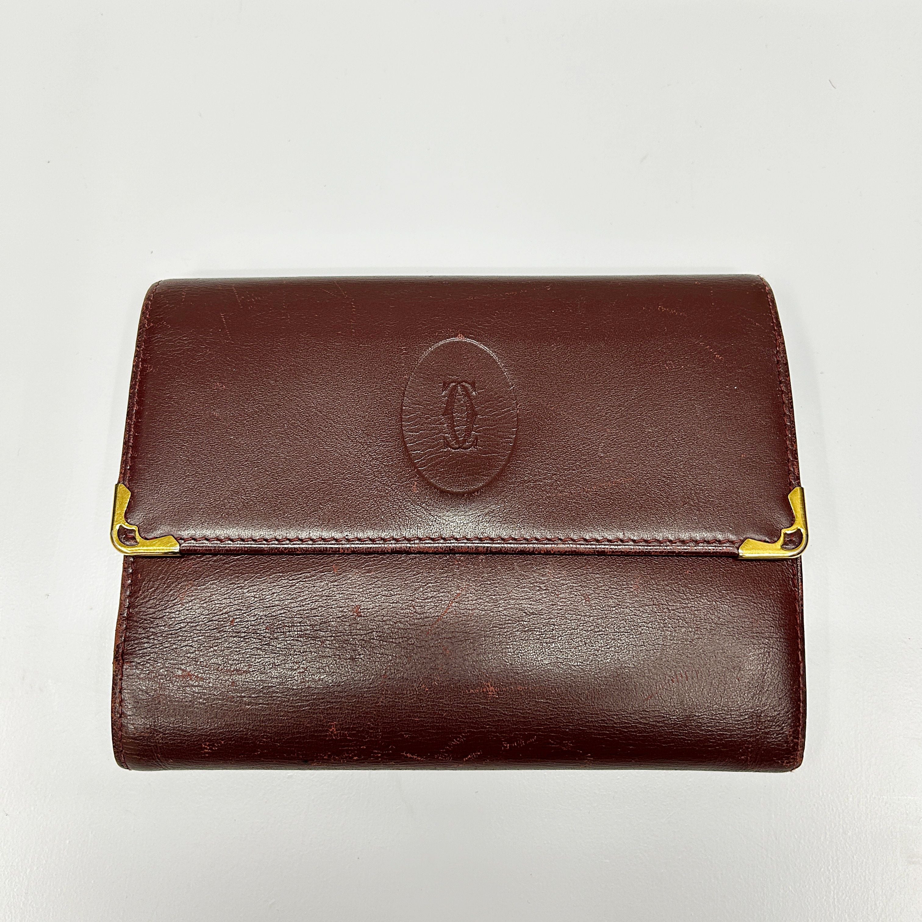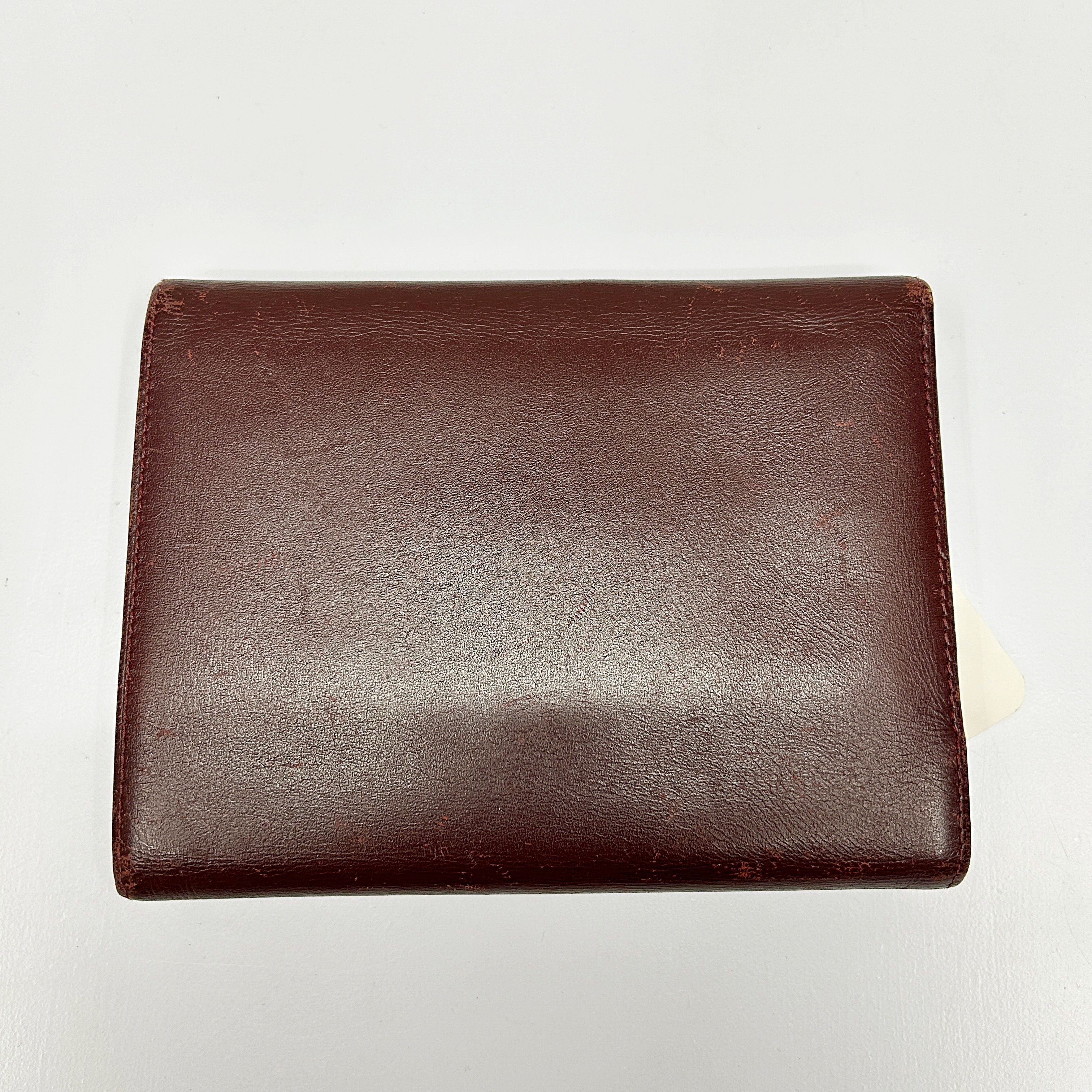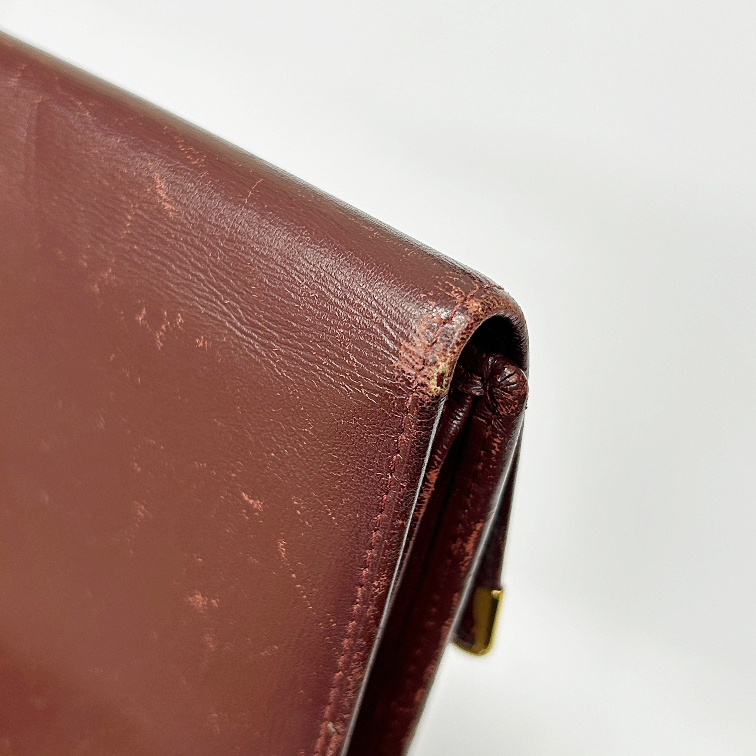 CONDITION Fair Good Very Good Great Excellent Pristine Condition Details Scratched on the corner, with damage on the outer side Serial Model • No Chip Authentication • Entrupy Packaging • Original Authentication Card OVERVIEW Exterior Color Brown Exterior Material Leather Lining Color Beige Lining Material Leather Handle/Strap Color Brown Handle/Strap Material Leather Hardware Color Gold Closure Snap Button Pattern Vintage Size 3 x 4.5 x 0.5 Introducing the Cartier Vintage Leather Wallet, a timeless accessory designed for discerning women. Crafted from premium brown leather with a beige leather lining, this slim wallet features elegant gold hardware and a secure snap button closure. Measuring 3 x 4.5 x 0.5 inches, it offers a compact yet functional design. This pre-owned piece is in great condition (8.5/10), with minor scratches on the corner and slight damage on the outer side, reflecting its vintage charm. Accompanied by the original authentication card and verified by Entrupy, it is a sophisticated choice for those who appreciate classic luxury.