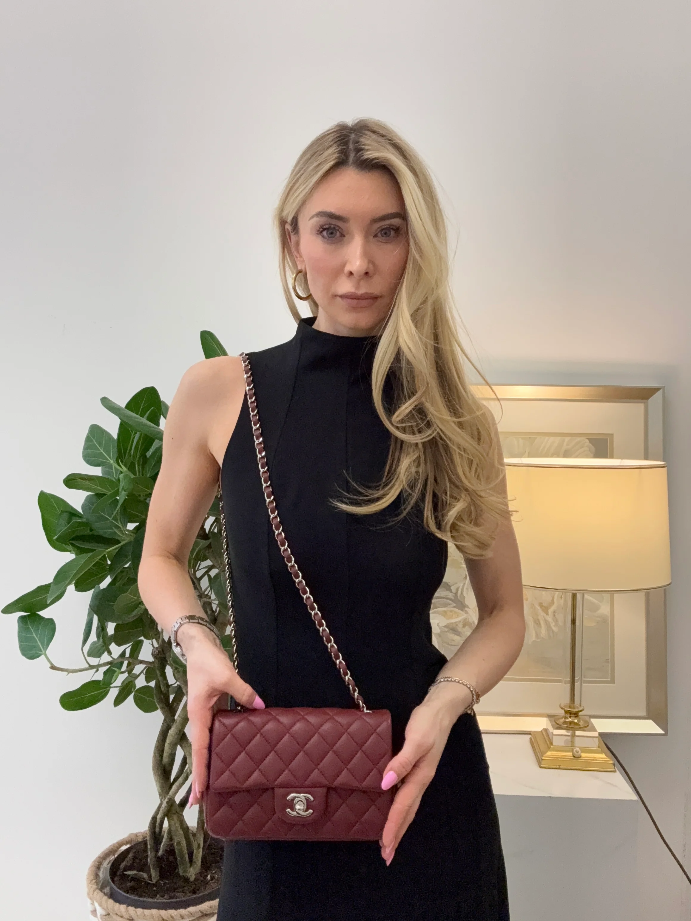 A modern classic from 2020, this Chanel Mini Tangle Classic Flap Bag is crafted in rich Burgundy Red leather — bold, elegant, and timeless. Featuring the iconic interlocking CC turn-lock closure and silver-tone hardware, it embodies Chanel’s signature sophistication in a compact, versatile silhouette. The bag is perfect for day or evening wear, offering a refined touch of luxury to any ensemble. Arrives in excellent pre-loved condition, ready to be cherished.