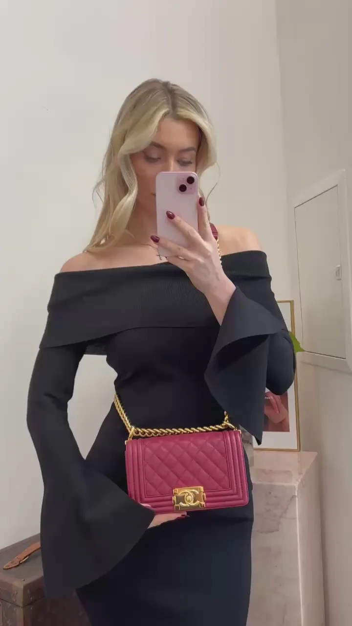 A contemporary classic, the Chanel Burgundy Small Le Boy Bag in Caviar Leather (2018–2019) combines classic Chanel elegance with edgy design. Made from sturdy burgundy caviar leather and adorned with vintage gold-tone hardware, this bag's modern appeal is defined by its distinctive Boy push-lock clasp and striking linear quilting.